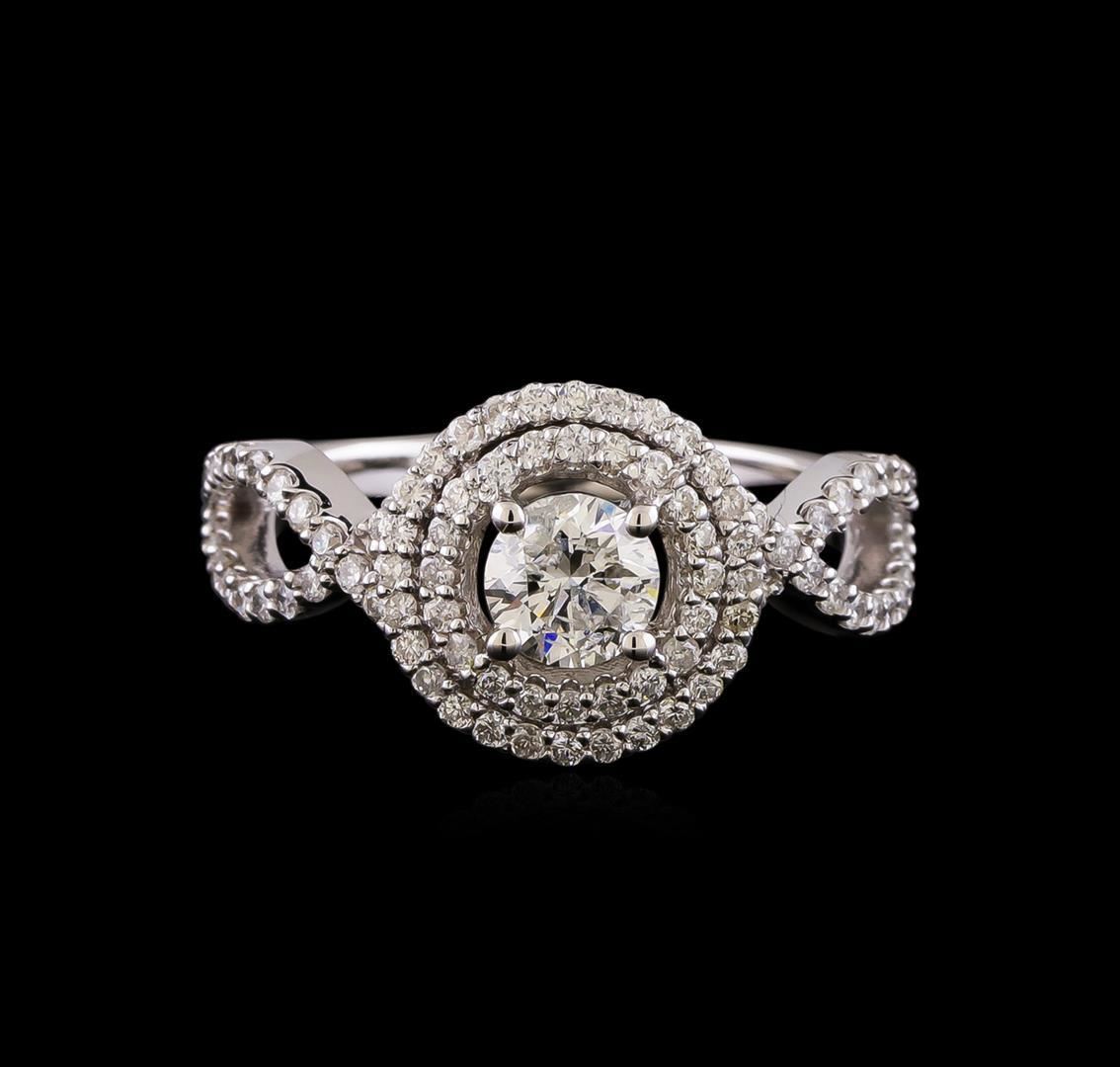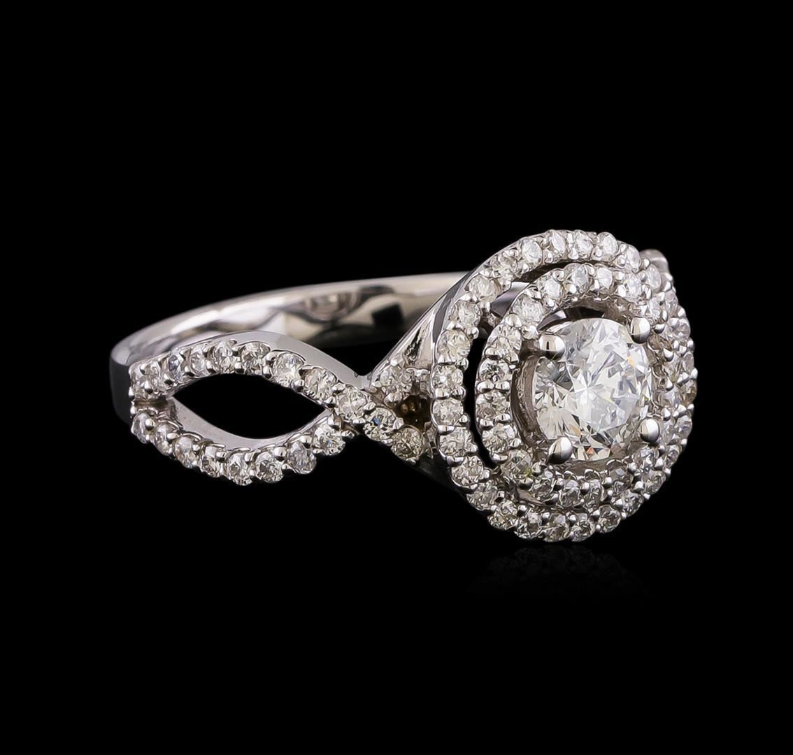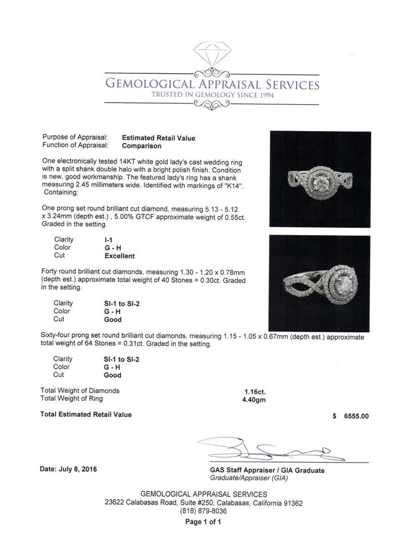 One electronically tested 14KT white gold lady's cast wedding ring with a split shank double halo with a bright polish finish. The featured lady's ring has a shank measuring 2.45 millimeters wide. Identified with markings of "K14". Condition is new, good workmanship. Containing: One prong set round brilliant cut diamond, measuring 5.13 - 5.12 x 3.24mm (depth est.) , 5.00.%. GTCF approximate weight of 0.55ct. Graded in the setting. Clarity: I-1. Color: G - Excellent Forty round brilliant cut diamonds, measuring 1.30 - 1.20 x 0.78mm (depth est.) approximate total weight of 40 Stones = 0.30ct. Graded in the setting. Clarity: SI-1 to SI-2. Color: G - Good Sixty-Four prong set round brilliant cut diamonds, measuring 1.15 - 1.05 x 0.67mm (depth est.) approximate total weight of 64 Stones = 0.31ct. Graded in the setting. Clarity: SI-1 to SI-2. Color: G - Good. Total Weight of Diamonds 1.16ct. Total Weight of Ring 4.40gm. GAS Appraised.