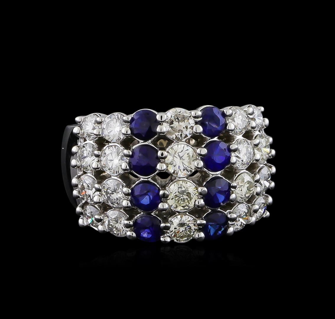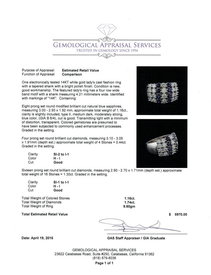 One electronically tested 14KT white gold lady's cast fashion ring with a tapered shank with a bright polish finish. The featured lady's ring has a four row wide band motif with a shank measuring 4.21 millimeters wide. Identified with markings of "14K". Condition is new, good workmanship. Containing: Eight prong set round modified brilliant cut natural blue sapphires, measuring 3.00 - 2.90 x 1.92 mm, approximate total weight of 1.16ct., clarity is slightly included, type II, medium dark, moderately strong, blue color, (GIA B 6/4), cut is good. Transmitting light with a minimum of distortion, transparent. Colored gemstones are presumed to have been subjected to commonly used enhancement processes. Graded in the setting. Four prong set round brilliant cut diamonds, measuring 3.10 - 3.05 x 1.91mm (depth est.) approximate total weight of 4 Stones = 0.44ct. Graded in the setting. Clarity: SI-2 to I-1. Color: H - I. Cut Good Sixteen prong set round brilliant cut diamonds, measuring 2.90 - 2.70 x 1.71mm (depth est.) approximate total weight of 16 Stones = 1.30ct. Graded in the setting. Clarity: SI-1 to I-1. Color: H - I. Cut Good. Total Weight of Colored Stones 1.16ct. Total Weight of Diamonds 1.74ct. Total Weight of Ring 9.60gm. GAS Appraised.