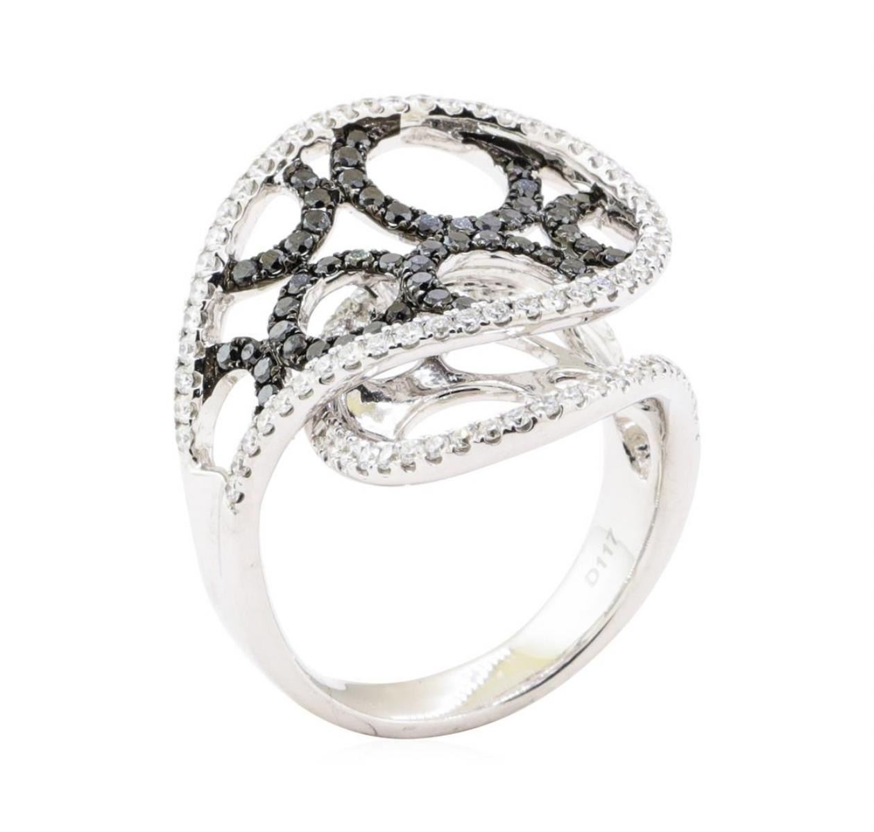 One electronically tested 18KT white gold lady's combination cast & assembled fashion ring with a overlapping split shank with a bright polish finish. The featured lady's ring has a shank measuring 3.70 millimeters wide. Identified with markings of '18K 750'. Condition is new, good workmanship. Containing: Fifty prong set round brilliant cut treated diamonds, measuring 1.40 - 1.30 x 0.92mm (depth est.) approximate total weight of 50 Stones = 0.51ct. Colored gemstones are presumed to have been subjected to commonly used enhancement processes. The featured diamonds are set in black rhodium plated prongs. Graded in the setting. Color Fancy Black Cut Good Ninety-Two prong set round brilliant cut diamonds, measuring 1.30 - 1.20 x 0.75mm (depth est.) approximate total weight of 92 Stones = 0.66ct. Graded in the setting. Color G - H Clarity SI-1 to SI-2 Cut Very Good. Total Weight of Diamonds 1.17ct.. Total Weight of Ring 9.50gm GAS Appraised at $5225.00. GAS Appraised.