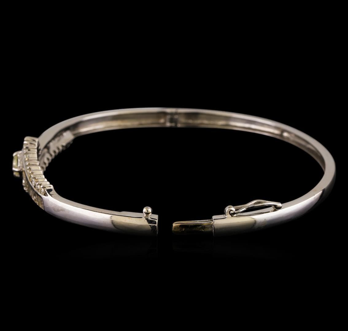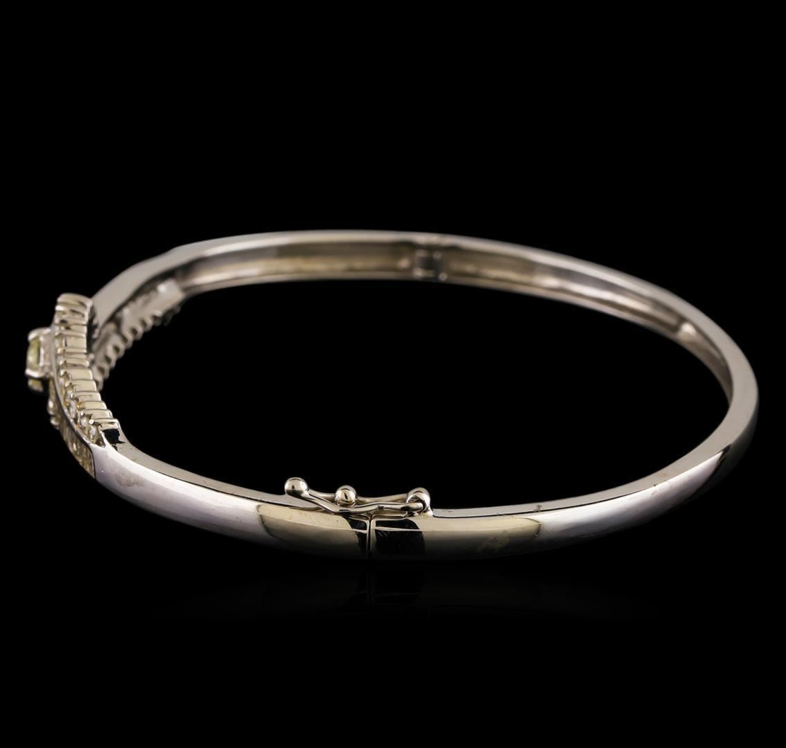 One electronically tested 14KT white gold ladies cast & assembled diamond bangle bracelet. Six and one-half inch wearable length bracelet features a center diamond set between stylized diamond ribbons. The bracelet tapers from eleven millimeters to three millimeters wide, supported by hinged shoulders, terminating in a concealed clasp with safety. Bright polish finish. Identified with markings of '14K'. Condition is good. Containing: One prong set round brilliant cut diamond, measuring 3.60 - 3.60 x 2.40mm (depth est.) approximate weight of 0.19ct with a strong blue fluorescence. Graded in the setting. Clarity VVS-2. Color: N Depth 66.7%. Table: 61.1%. Thirty-Four channel set baguette cut (tapered) diamonds, measuring from 1.00 x 0.70 x 0.49mm (depth est.) to 2.50 x 1.40 x 0.98mm (depth est.) approximate total weight of 34 Stones = 0.52ct. Graded in the setting. Clarity I-1 to I-3. Color: J - L Thirty prong set round brilliant cut diamonds, measuring 1.60 - 1.55 x 0.95mm (depth est.) approximate total weight of 30 Stones = 0.46ct. The color grade reflects the range of color for this group. Graded in the setting. Clarity I-1 to I-2. Color: H - K. Total Weight of Diamonds 1.17ct.. Total Weight of Bracelet 11.32gm. AIG Appraised.