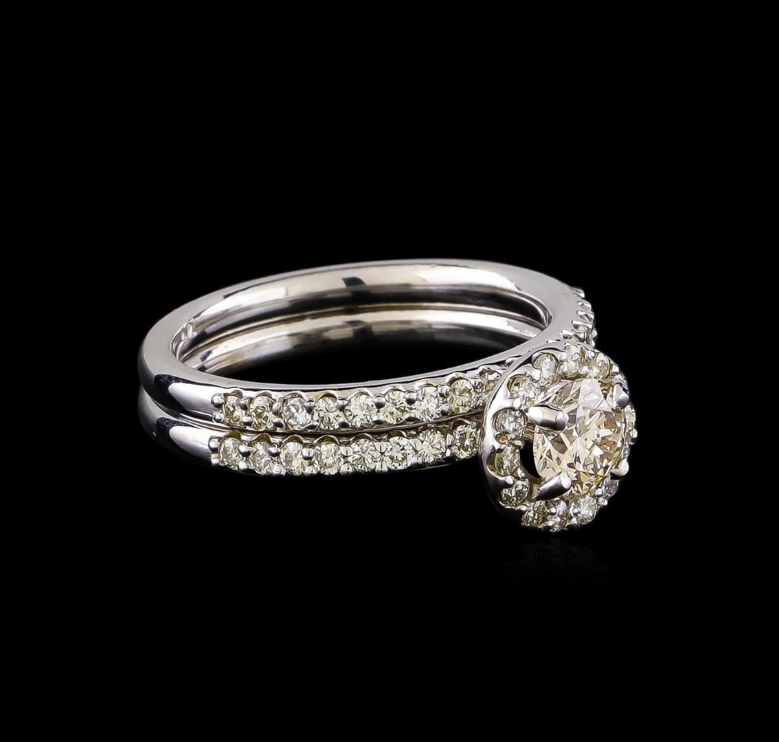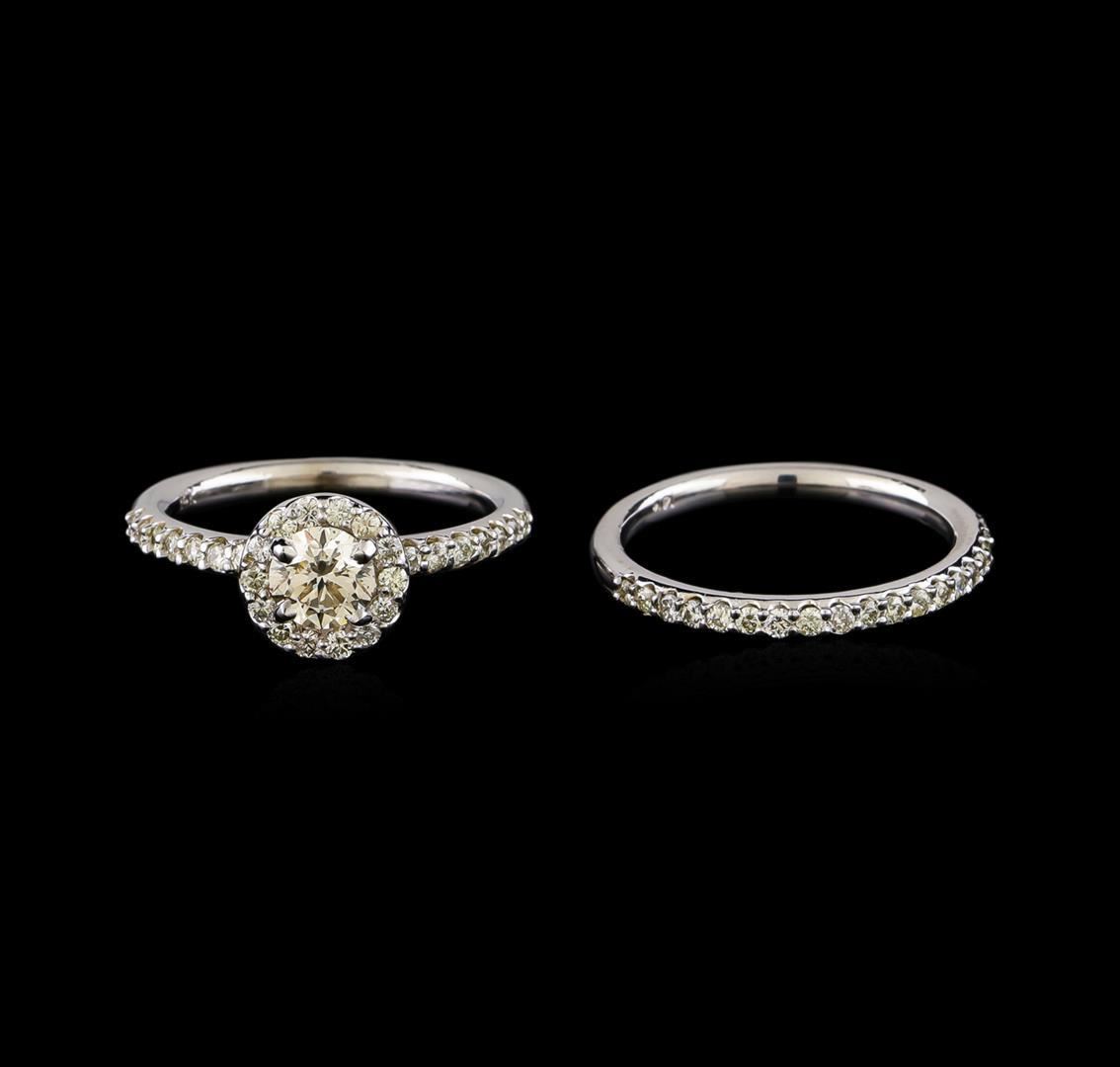 One electronically tested 14KT white gold ladies cast diamond wedding set with a bright polish finish. The wedding set includes a diamond engagement ring and diamond wedding band. The engagement ring features a round brilliant diamond set within a diamond bezel supported by diamond ribbon shoulders. The matching wedding band features a diamond ribbon. Each ring is completed by a two millimeter wide band. Identified with markings of "14K". Condition is new, good workmanship. Containing: One prong set round brilliant cut diamond, measuring 5.30 - 5.30 x 3.18mm (depth est.) approximate weight of 0.55ct with a medium blue fluorescence. Graded in the setting. Clarity: SI-1. Color: L. Depth 60.0%. Table 58.5%. Forty-Nine prong set round brilliant cut diamonds, measuring 1.50 - 1.50 x 0.90mm (depth est.) approximate total weight of 49 Stones = 0.62ct. Color & clarity grade are an average for the group. Graded in the setting. Clarity: SI-2 to I-1. Color: I - K. Total Weight of Diamonds 1.17ct. Total Weight of Wedding Set 5.07gm. AIG Appraised.