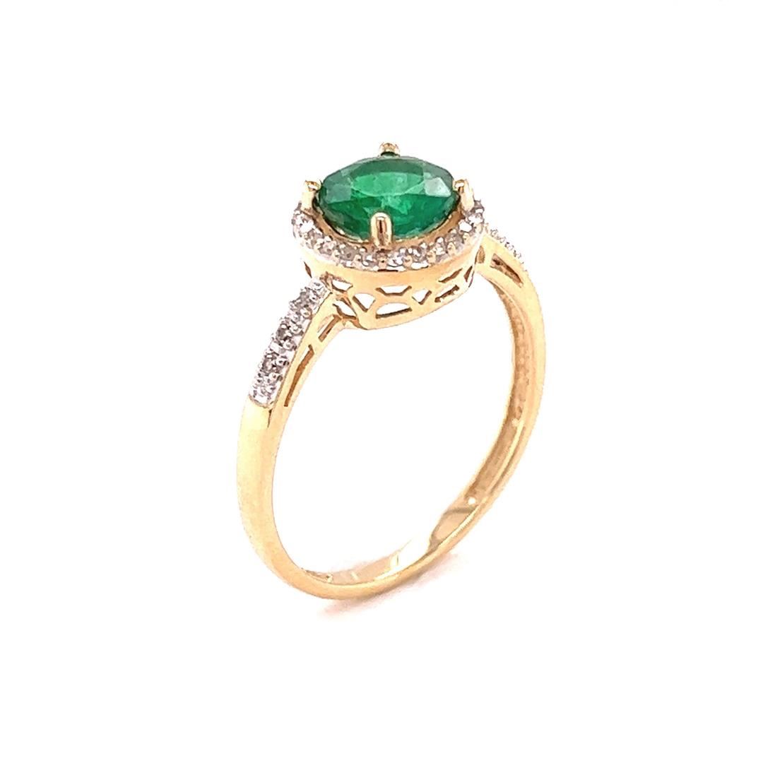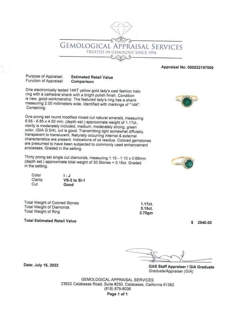 One electronically tested 14KT yellow gold lady's cast fashion halo ring with a cathedral shank with a bright polish finish. Condition is new, good workmanship. The featured lady's ring has a shank measuring 2.00 millimeters wide. Identified with markings of "14K". Containing: One prong set round modified mixed cut natural emerald, measuring 6.95 - 6.85 x 4.50 mm, (depth est.) approximate weight of 1.17ct., clarity is moderately included, medium, moderately strong, green color, (GIA G 5/4), cut is good. Transmitting light somewhat diffusely, transparent to translucent. Naturally occurring internal & external characteristics are present. Indications of oil residue. Colored gemstones are presumed to have been subjected to commonly used enhancement processes. Graded in the setting. Thirty prong set single cut diamonds, measuring 1.15 - 1.10 x 0.68mm (depth est.) approximate total weight of 30 Stones = 0.15ct. Graded in the setting. Color I - J Clarity VS-2 to SI-1 Cut Good Total Weight of Colored Stones Total Weight of Diamonds Total Weight of Ring 1.17ct. 0.15ct. 2.70gm Appraisal No: 000022197006 Total Estimated Retail Value $ 2940.00