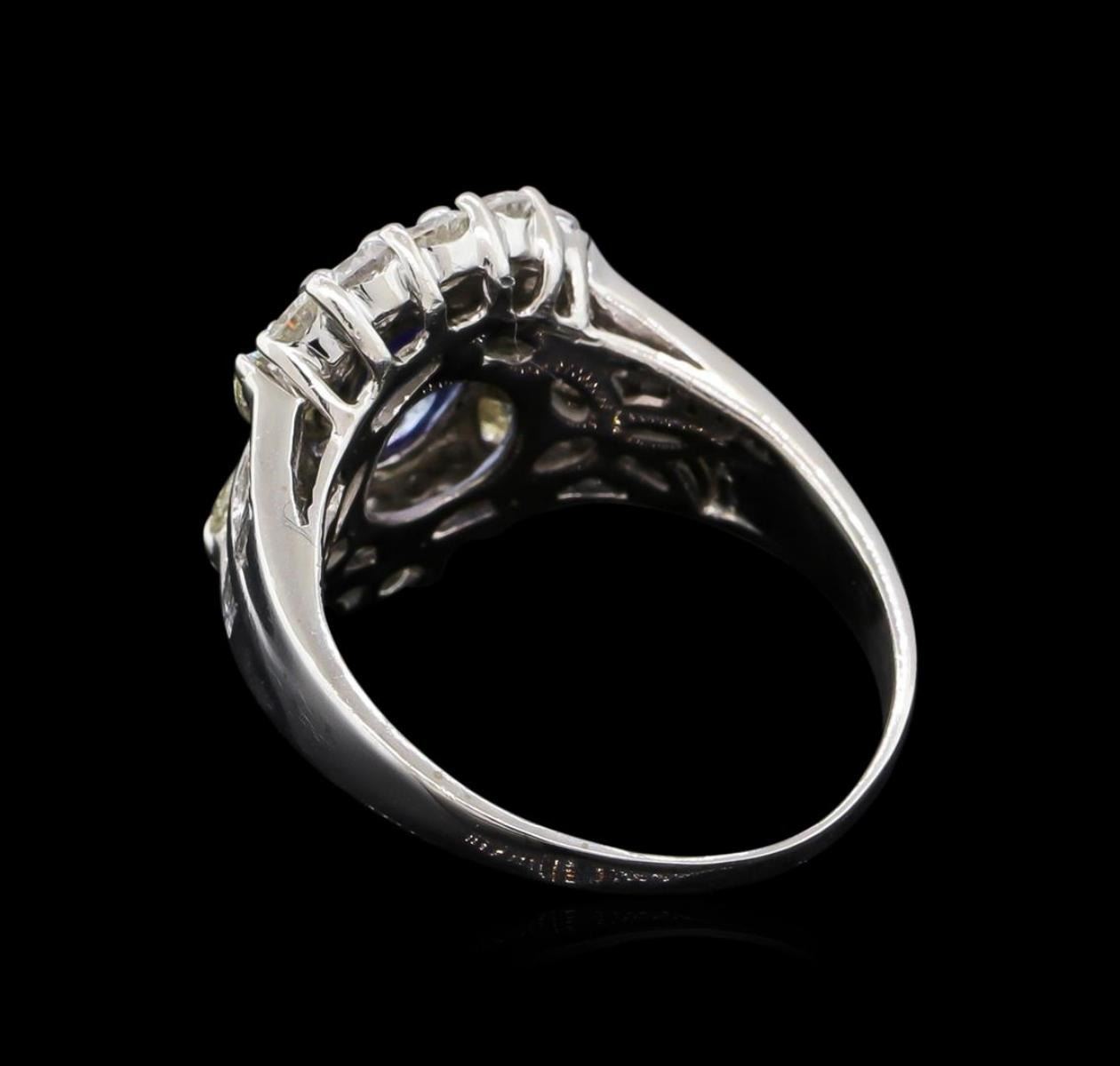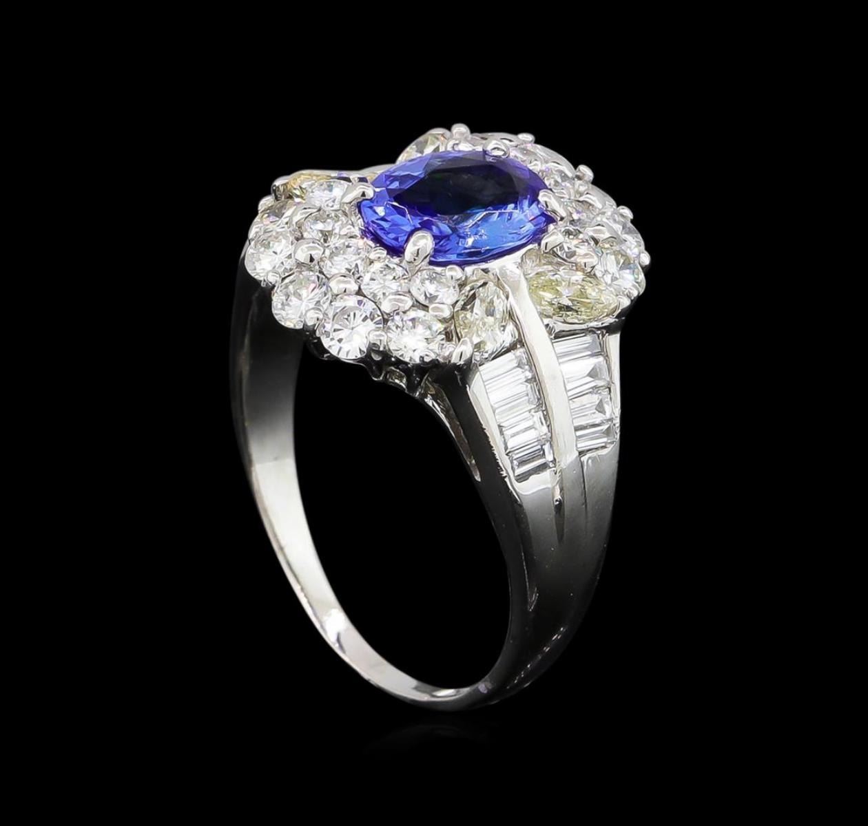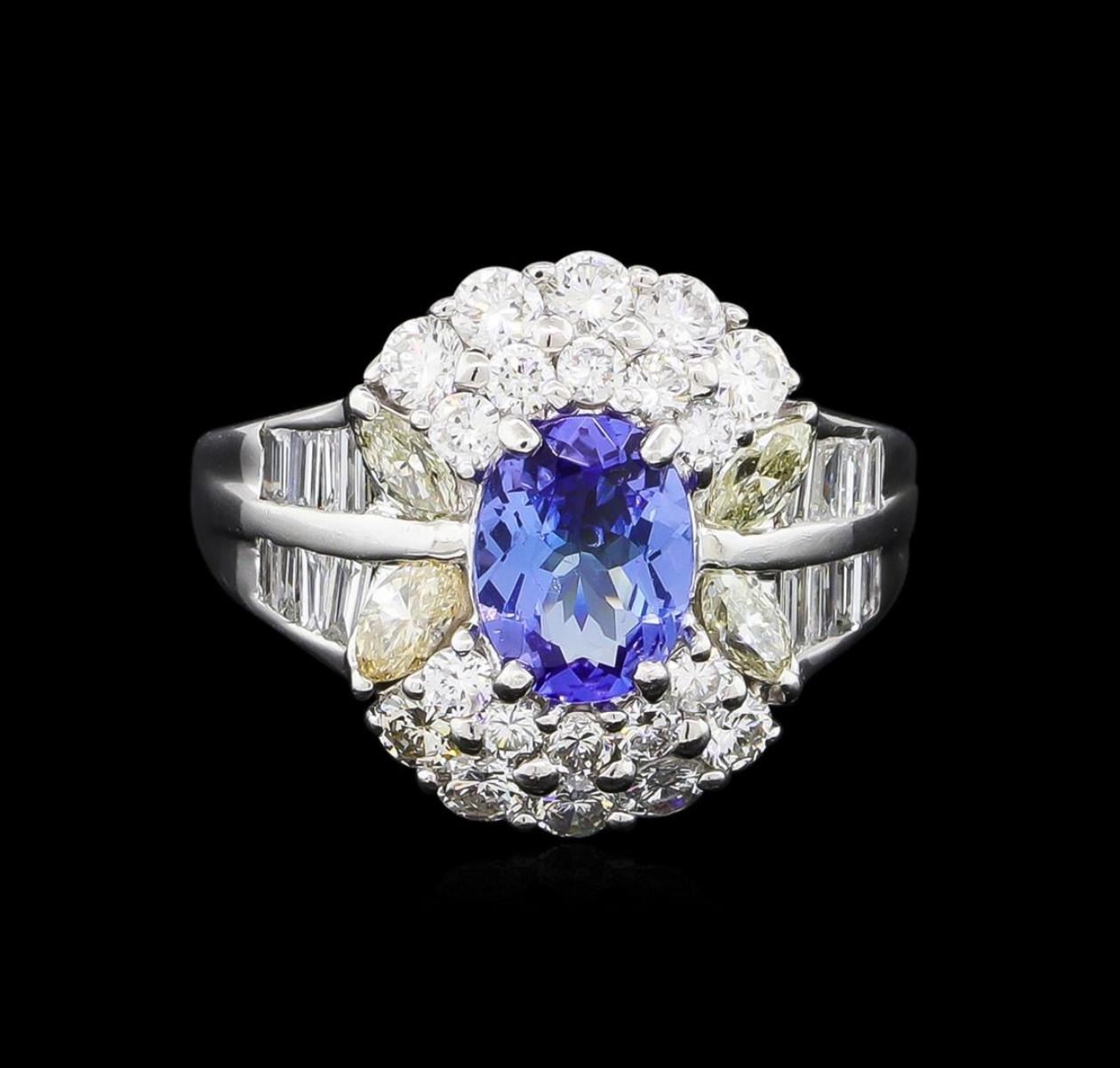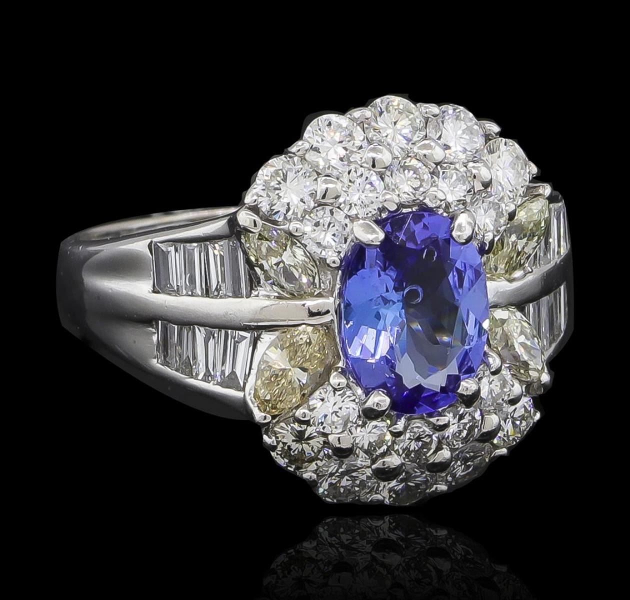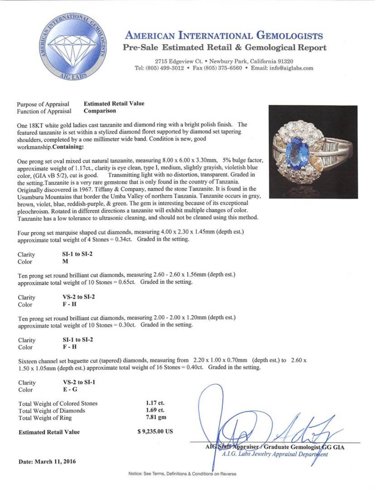 one millimeter wide band. Condition is new, good workmanship. Containing: One prong set oval mixed cut natural tanzanite, measuring 8.00 x 6.00 x 3.30mm, 5%. bulge factor, approximate weight of 1.17ct., clarity is eye clean, type I, medium, slightly grayish, violetish blue color, (GIA vB 5/2), cut is good. Transmitting light with no distortion, transparent. Graded in the setting. Tanzanite is a very rare gemstone that is only found in the country of Tanzania. Originally discovered in 1967. Tiffany & Company, named the stone Tanzanite. It is found in the Usumburu Mountains that border the Umba Valley of northern Tanzania. Tanzanite occurs in gray, brown, violet, blue, reddish-purple, & green. The gem is interesting because of its exceptional pleochroism. Rotated in different directions a tanzanite will exhibit multiple changes of color. Tanzanite has a low tolerance to ultrasonic cleaning, and should not be cleaned using this method. Four prong set marquise shaped cut diamonds, measuring 4.00 x 2.30 x 1.45mm (depth est.) approximate total weight of 4 Stones = 0.34ct. Graded in the setting. Clarity: SI-1 to SI-2. Color: M Ten prong set round brilliant cut diamonds, measuring 2.60 - 2.60 x 1.56mm (depth est.) approximate total weight of 10 Stones = 0.65ct. Graded in the setting. Clarity: VS-2 to SI-2. Color: F - H Ten prong set round brilliant cut diamonds, measuring 2.00 - 2.00 x 1.20mm (depth est.) approximate total weight of 10 Stones = 0.30ct. Graded in the setting. Clarity: SI-1 to SI-2. Color: F - H Sixteen channel set baguette cut (tapered) diamonds, measuring from 2.20 x 1.00 x 0.70mm (depth est.) to 2.60 x 1.50 x 1.05mm (depth est.) approximate total weight of 16 Stones = 0.40ct. Graded in the setting. Clarity: VS-2 to SI-1. Color: E - G. Total Weight of Colored Stones 1.17ct. Total Weight of Diamonds 1.69ct. Total Weight of Ring 7.81gm. AIG Appraised at $9,235.00.