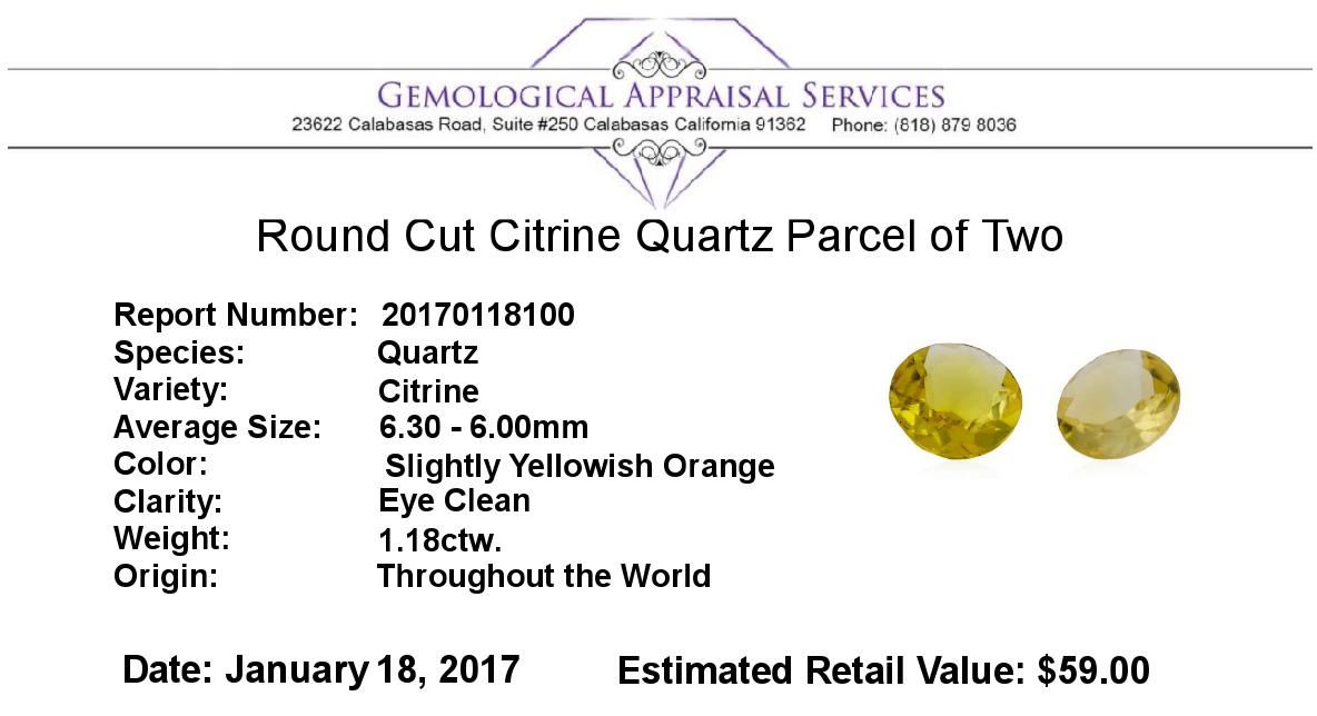 One natural round cut citrine quartz parcel of two with an exact weight of 1.18ctw., clarity is eye clean, slightly yellowish orange. Gemological Appraisals Services estimates the retail value at $59 GAS Appraised.