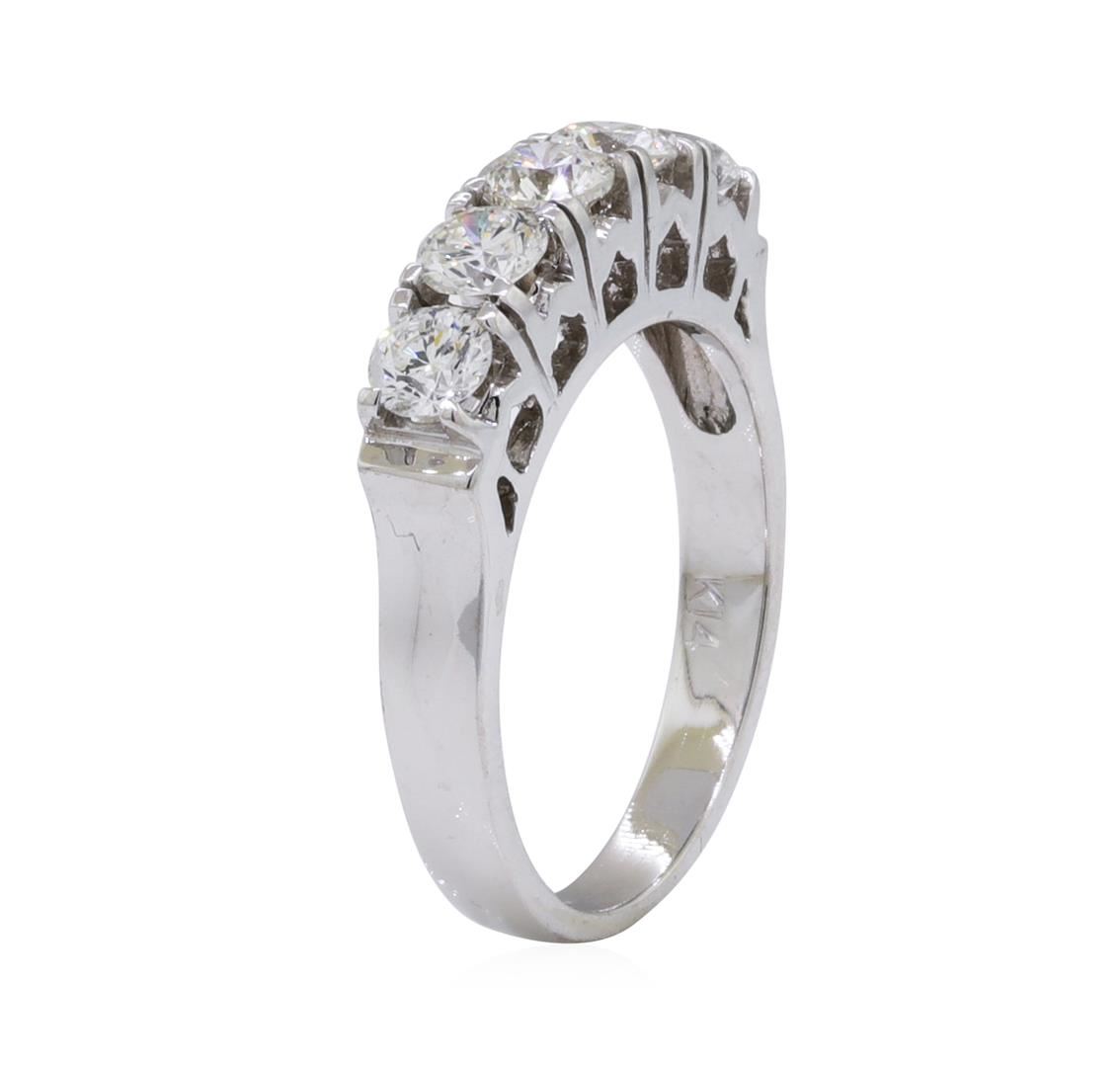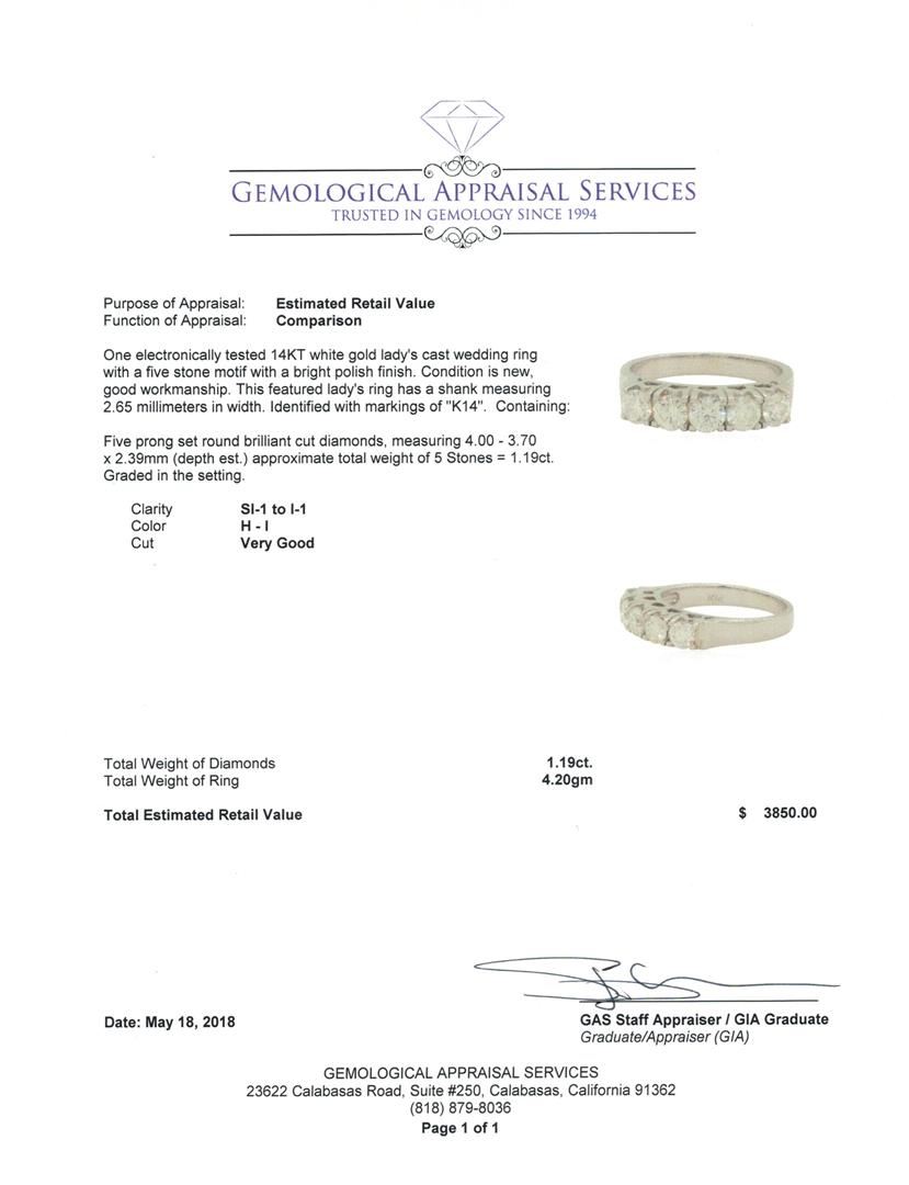 One electronically tested 14KT white gold lady's cast wedding ring with a five stone motif with a bright polish finish. This featured lady's ring has a shank measuring 2.65 millimeters in width. Identified with markings of 'K14'. Condition is new, good workmanship. Containing: Five prong set round brilliant cut diamonds, measuring 4.00 - 3.70 x 2.39mm (depth est.) approximate total weight of 5 Stones = 1.19ct. Graded in the setting. Color H - I Clarity SI-1 to I-1 Cut Very Good. Total Weight of Diamonds 1.19ct.. Total Weight of Ring 4.20gm GAS Appraised at $3850.00. GAS Appraised.
