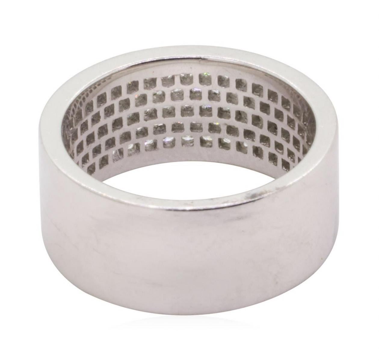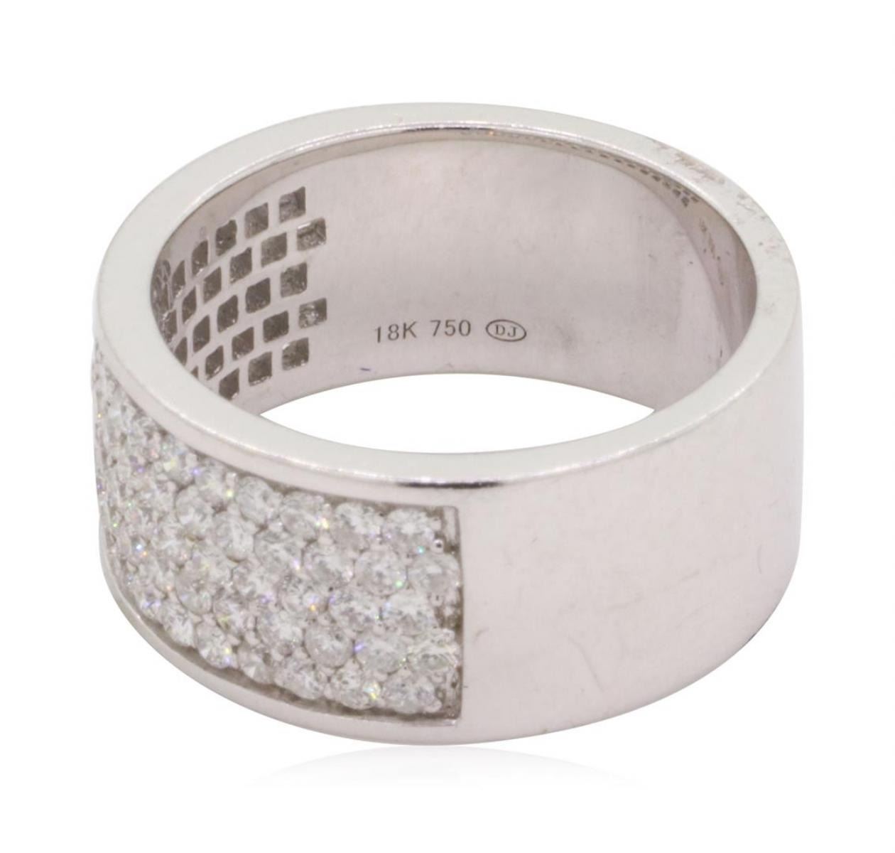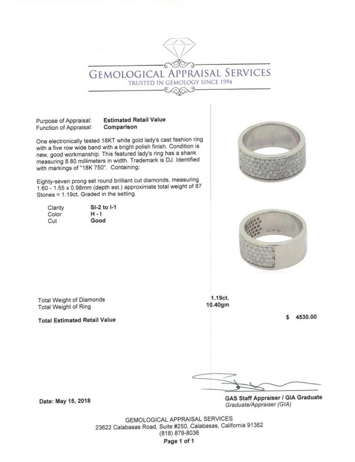 One electronically tested 18KT white gold lady's cast fashion ring with a five row wide band with a bright polish finish. This featured lady's ring has a shank measuring 8.80 millimeters in width. Trademark is DJ. Identified with markings of '18K 750'. Condition is new, good workmanship. Containing: Eighty-Seven prong set round brilliant cut diamonds, measuring 1.60 - 1.55 x 0.98mm (depth est.) approximate total weight of 87 Stones = 1.19ct. Graded in the setting. Color H - I Clarity SI-2 to I-1 Cut Good. Total Weight of Diamonds 1.19ct.. Total Weight of Ring 10.40gm GAS Appraised at $4530.00. GAS Appraised.