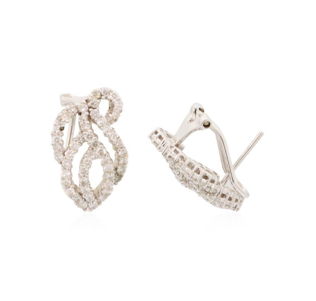 One pair electronically tested 18KT white gold lady's combination cast & assembled fashion earrings with Omega clip backs with posts with a bright polish finish. Identified with markings of '18K'. Condition is new, good workmanship. Containing: One Hundred Two prong set round brilliant cut diamonds, measuring 1.50 - 1.45 x 0.89mm (depth est.) approximate total weight of 102 Stones = 1.20ct. Graded in the setting. Color H - I Clarity SI-2 to I-1 Cut Good. Total Weight of Diamonds 1.20ct.. Total Weight of Earrings 6.40gm GAS Appraised at $3225.00. GAS Appraised.