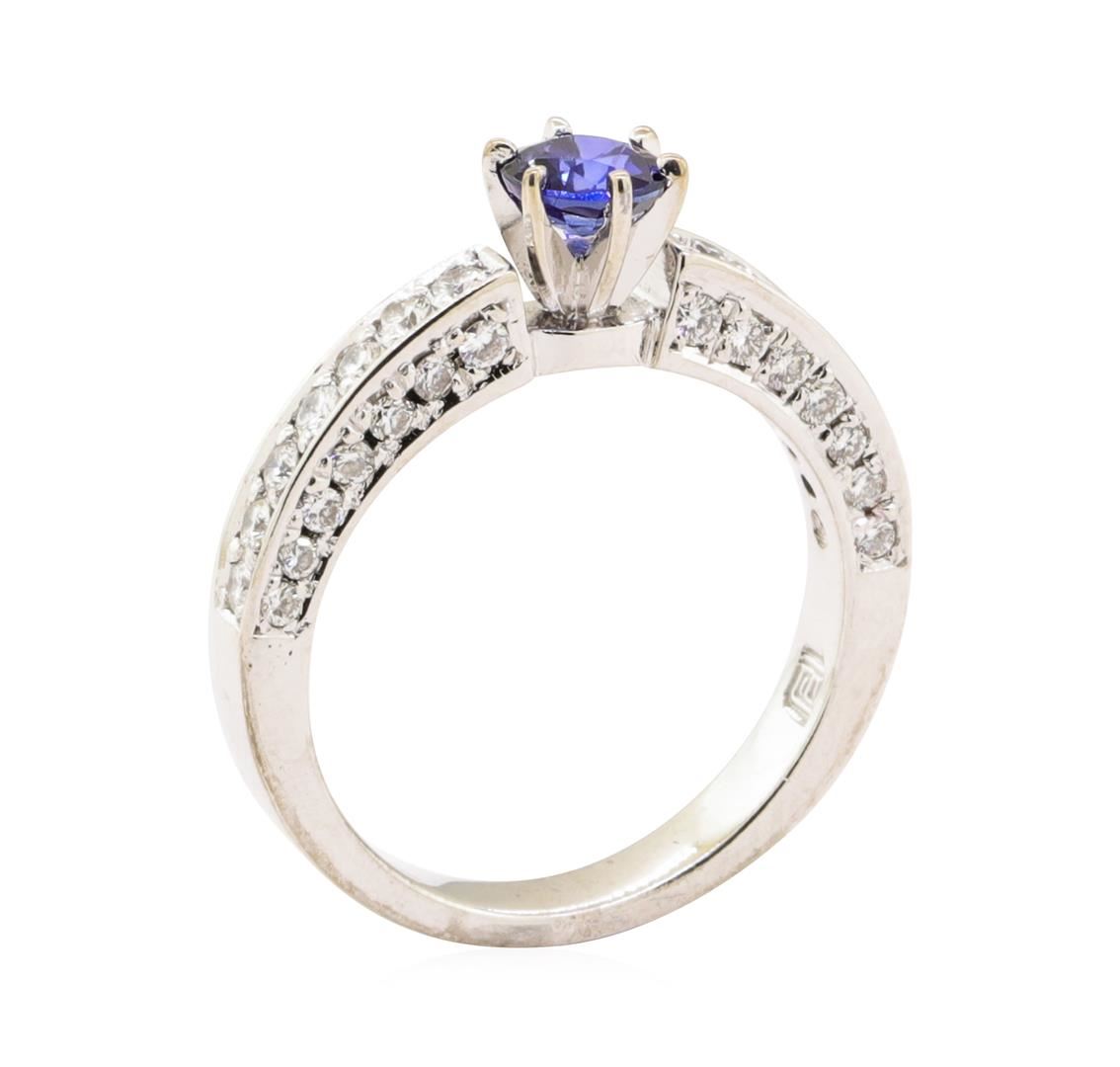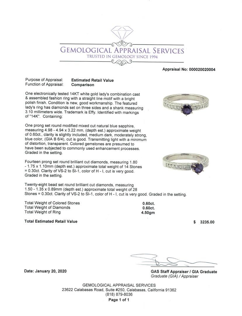 One electronically tested 14KT white gold lady's combination cast & assembled fashion ring with a straight line motif with a bright polish finish. The featured lady's ring has diamonds set on three sides and a shank measuring 3.10 millimeters wide. Trademark is Effy. Identified with markings of '14K'. Condition is new, good workmanship. Containing: One prong set round modified mixed cut natural blue sapphire, measuring 4.98 - 4.94 x 3.22 mm, (depth est.) approximate weight of 0.60ct., clarity is slightly included, medium dark, moderately strong, blue color, (GIA B 6/4), cut is good. Transmitting light with a minimum of distortion, transparent. Colored gemstones are presumed to have been subjected to commonly used enhancement processes. Graded in the setting. Fourteen prong set round brilliant cut diamonds, measuring 1.80 - 1.75 x 1.10mm (depth est.) approximate total weight of 14 Stones = 0.30ct. Graded in the setting. Color H - I Clarity VS-2 to SI-1 Cut Very Good Twenty-Eight bead set round brilliant cut diamonds, measuring 1.50 - 1.35 x 0.89mm (depth est.) approximate total weight of 28 Stones = 0.30ct. Graded in the setting. Color H - I Clarity VS-2 to SI-1 Cut Very Good. Total Weight of Colored Stones 0.60ct.. Total Weight of Diamonds 0.60ct.. Total Weight of Ring 4.50gm GAS Appraised at $3235.00. GAS Appraised.