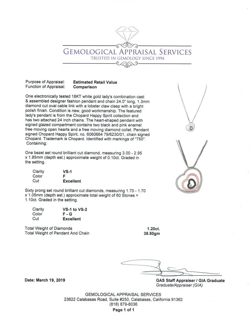 One electronically tested 18KT white gold lady's combination cast & assembled designer fashion pendant and chain 24.0' long, 1.3mm diamond cut oval cable link with a lobster claw clasp with a bright polish finish. The featured lady's pendant is from the Chopard Happy Spirit collection and has two attached 24 inch chains. The heart-shaped pendant with signed glazed compartment contains two black and pink enamel free moving open hearts and a free moving diamond collet. Pendant signed Chopard Happy Spirit, no. 6060664 79/6230/01, chain signed Chopard. Trademark is Chopard. Identified with markings of '750'. Condition is new, good workmanship. Containing: One bezel set round brilliant cut diamond, measuring 3.00 - 2.95 x 1.85mm (depth est.) approximate weight of 0.10ct. Graded in the setting. Color F Clarity VS-1 Cut Excellent Sixty prong set round brilliant cut diamonds, measuring 1.70 - 1.70 x 1.05mm (depth est.) approximate total weight of 60 Stones = 1.10ct. Graded in the setting. Color F - G Clarity VS-1 to VS-2 Cut Excellent. Total Weight of Diamonds 1.20ct.. Total Weight of Pendant And Chain 38.50gm GAS Appraised at $6805.00. GAS Appraised.