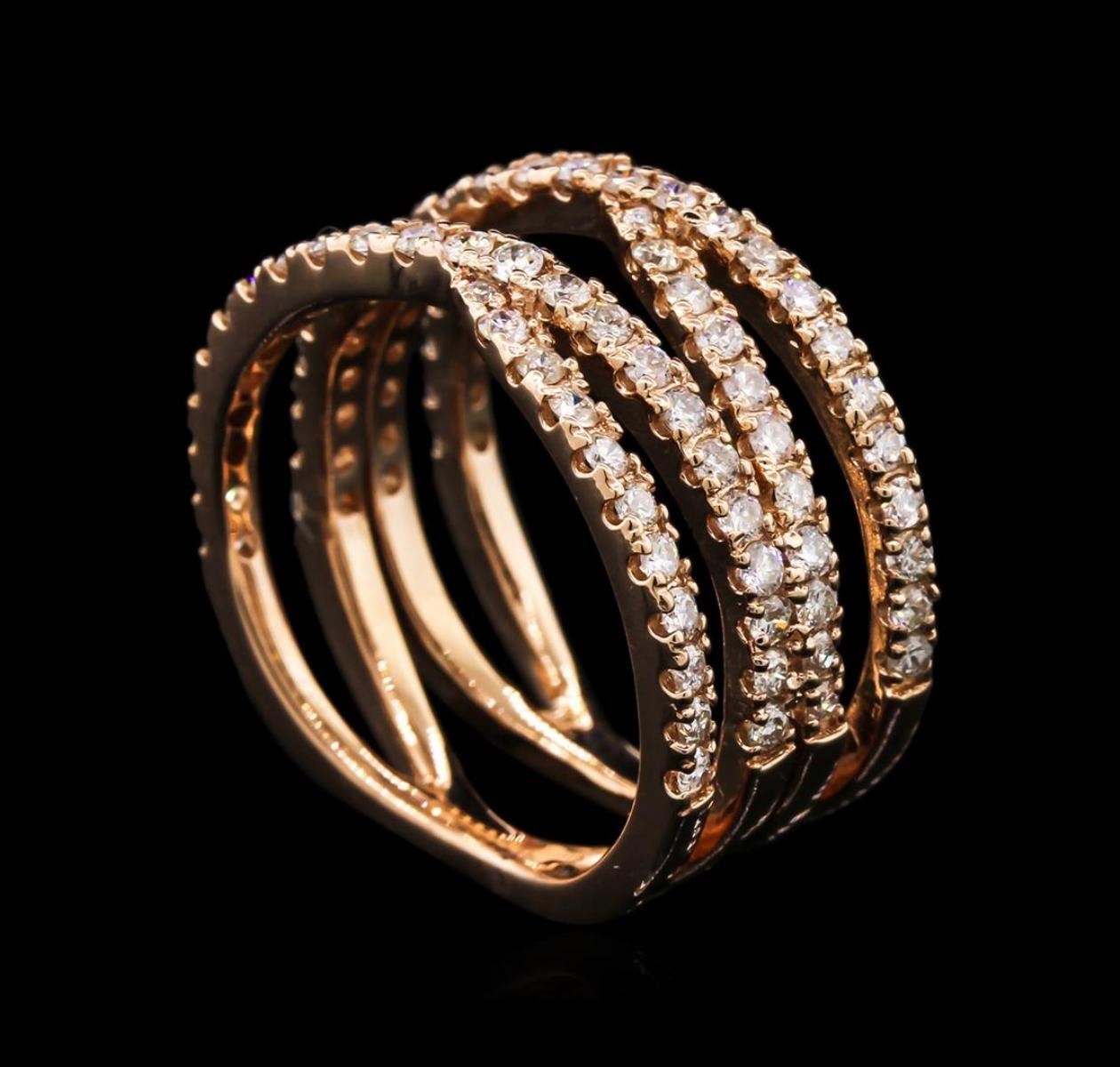 One electronically tested 14KT rose gold lady's cast fashion ring with a bright polish finish. The featured lady's ring has a double crossover motif and a double shank measuring 7.60 millimeters in width. Identified with markings of "14K". Condition is new, good workmanship. Containing: Eighty-Six prong set round brilliant cut diamonds, measuring 1.60 - 1.50 x 0.95mm (depth est.) approximate total weight of 86 Stones = 1.20ct. Graded in the setting. Clarity: SI-2 to I-1. Color: H - I. Cut Good. Total Weight of Diamonds 1.20ct. Total Weight of Ring 6.70gm at $3970.00.. GAS Appraised at $3,970.00.