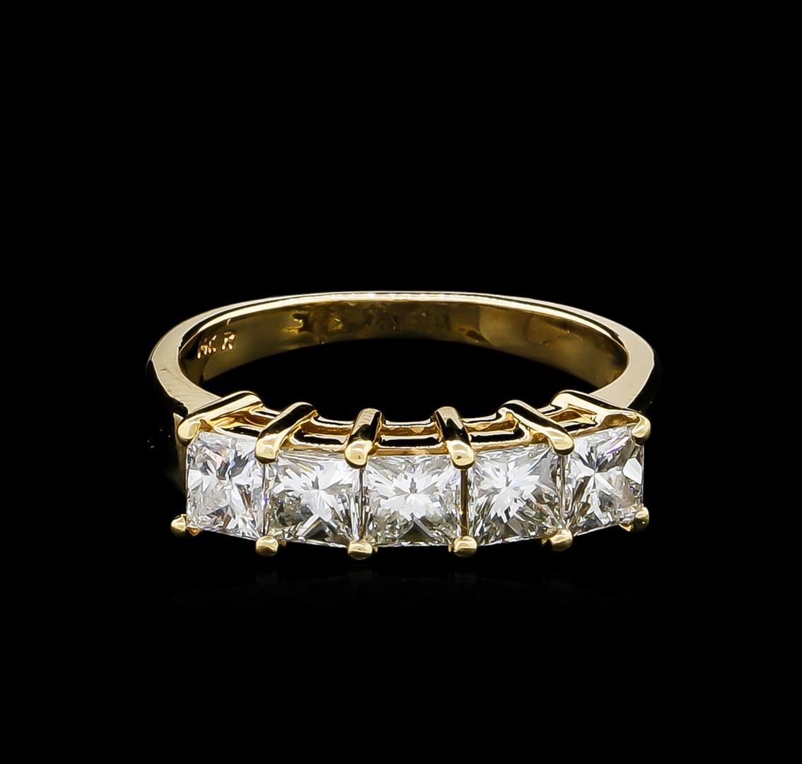 One electronically tested 14KT yellow gold ladies cast diamond ring with a bright polish finish. The ring features a ribbon of princess cut diamonds supported by tapering shoulders, completed by a one and one-half millimeter wide band. Identified with markings of "14K". Condition is good. Containing: Five prong set princess cut diamonds, measuring 3.60 x 3.40 x 2.38mm (depth est.) approximate total weight of 5 Stones = 1.20ct. Graded in the setting. Clarity: VS-1 to SI-1. Color: H - J. Total Weight of Diamonds 1.20ct. Total Weight of Ring 2.94gm. AIG Appraised.