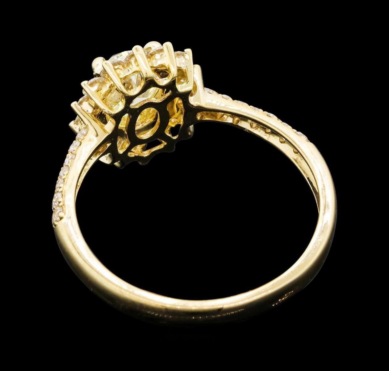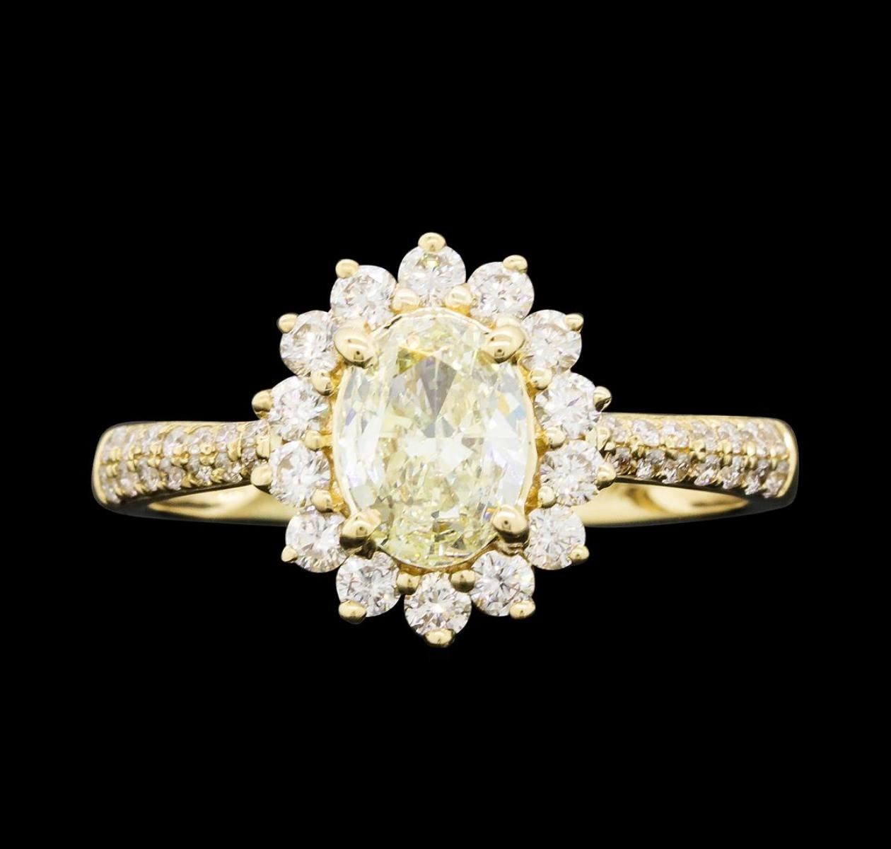 One electronically tested 14KT yellow gold lady's cast wedding ring with a scalloped basket halo with a bright polish finish. The featured lady's ring has a shank measuring 2.20 millimeters wide. Identified with markings of '14K'. Condition is new, good workmanship. Containing: One prong set oval shaped cut diamond, measuring 6.90 x 5.21 x 2.60mm (depth est.) , 15.00.%. GTCF approximate weight of 0.71ct. Graded in the setting. Color Fancy Light Yellow Clarity VS-2 Cut Very Good Fourteen prong set round brilliant cut diamonds, measuring 2.00 - 1.90 x 1.17mm (depth est.) approximate total weight of 14 Stones = 0.38ct. Graded in the setting. Color H - I Clarity VS-2 to SI-1 Cut Very Good Twenty-Eight prong set round brilliant cut diamonds, measuring 1.10 - 0.95 x 0.62mm (depth est.) approximate total weight of 28 Stones = 0.11ct. Graded in the setting. Color G - H Clarity SI-1 to SI-2 Cut Very Good. Total Weight of Diamonds 1.20 ct.. Total Weight of Ring 2.40gm GAS Appraised.