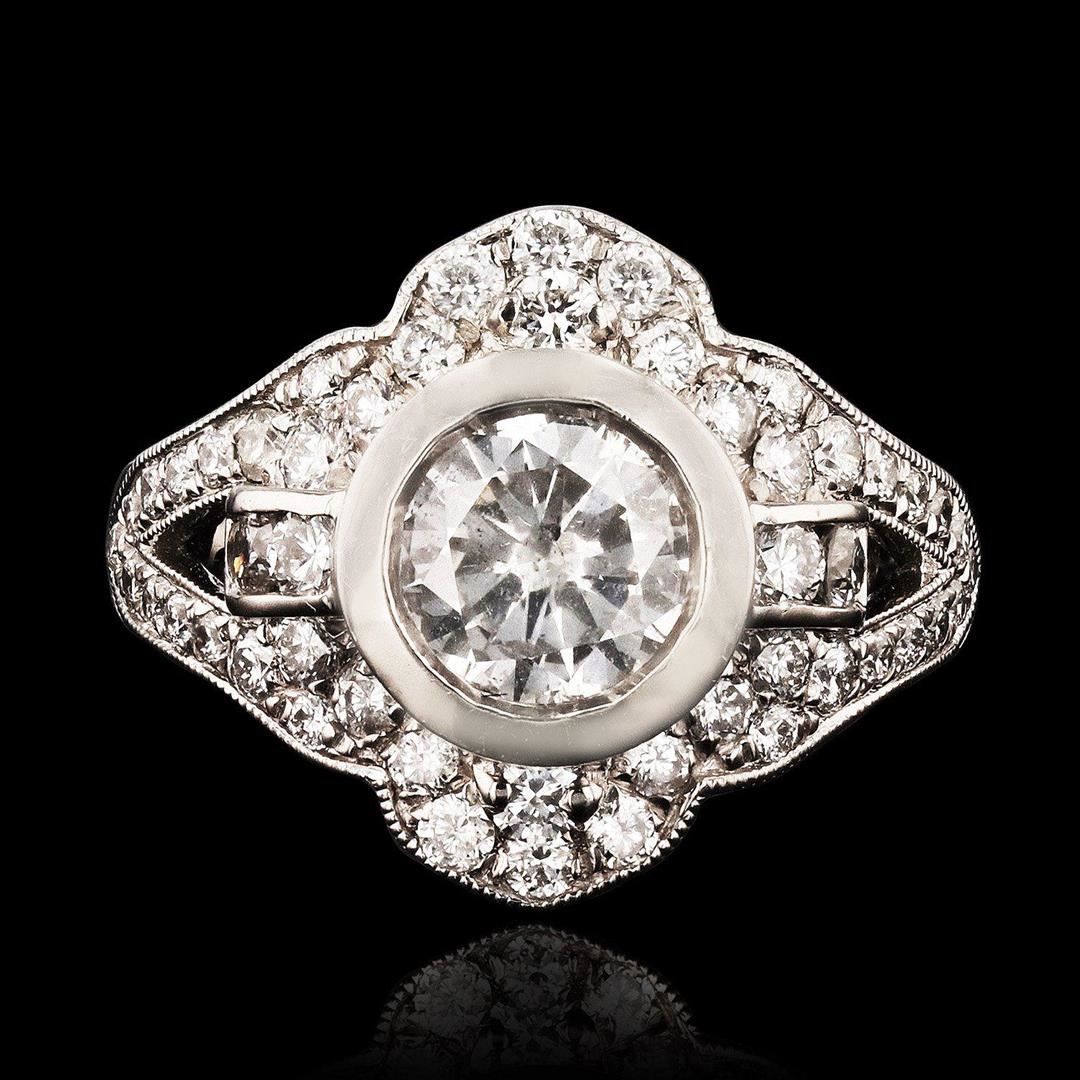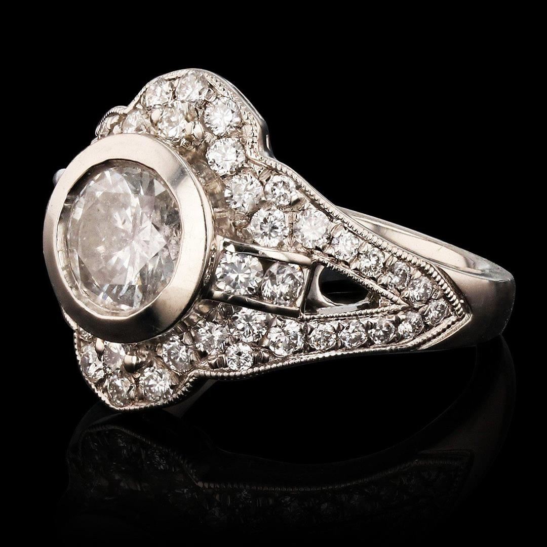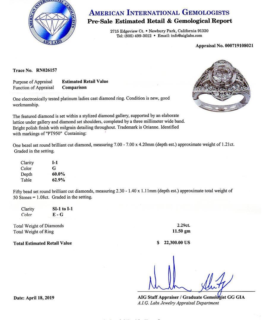 One electronically tested platinum ladies cast diamond ring. Condition is new, good workmanship. The featured diamond is set within a stylized diamond gallery, supported by an elaborate lattice under gallery and diamond set shoulders, completed by a three millimeter wide band. Bright polish finish with milgrain detailing throughout. Trademark is Orianne. Identified with markings of "PT950" Containing: One bezel set round brilliant cut diamond, measuring 7.00 - 7.00 x 4.20mm (depth est.) approximate weight of 1.21ct. Graded in the setting. Clarity I1 Color G Depth 60.0% Table 62.9% Fifty bead set round brilliant cut diamonds, measuring 2.30 - 1.40 x 1.11mm (depth est.) approximate total weight of 50 Stones = 1.08ctw. Graded in the setting. Clarity SI1 to I1 Color E - G Total Weight of Diamonds 2.29ctw. Total Weight of Ring 11.50 gm