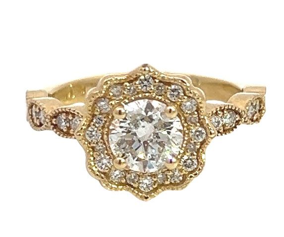 One electronically tested 14KT yellow gold lady's custom CAD/CAM wedding ring with a scalloped basket halo with a bright polish with migraine detailing finish. The featured lady's ring has a ribbon motif shank measuring 2.50 millimeters wide. Trademark is MJ. Identified with markings of "14K". Condition is new, good workmanship. Containing: One prong set round brilliant cut diamond, measuring 5.97 - 5.93 x 3.73mm (depth est.) approximate weight of 0.82ct. Graded loose prior to setting in the GIA Laboratory, Report #2215086227. Laser inscribed on girdle. Color K Clarity I-2 Cut Very Good Twelve prong set round brilliant cut diamonds, measuring 1.80 - 1.70 x 1.09mm (depth est.) approximate total weight of 12 Stones = 0.25ct. Graded in the setting. Color G - H Clarity VS-2 to SI-1 Cut Very Good Twenty prong set round brilliant cut diamonds, measuring 1.30 - 1.10 x 0.74mm (depth est.) approximate total weight of 20 Stones = 0.14ct. Graded in the setting. Color G - H Clarity VS-2 to SI-1 Cut Very Good Total Weight of Diamonds 1.21ct. Total Weight of Ring 4.20gm Estimated Retail Value $ 9500.00