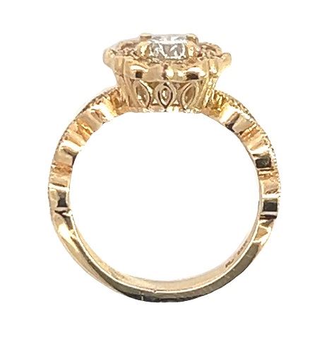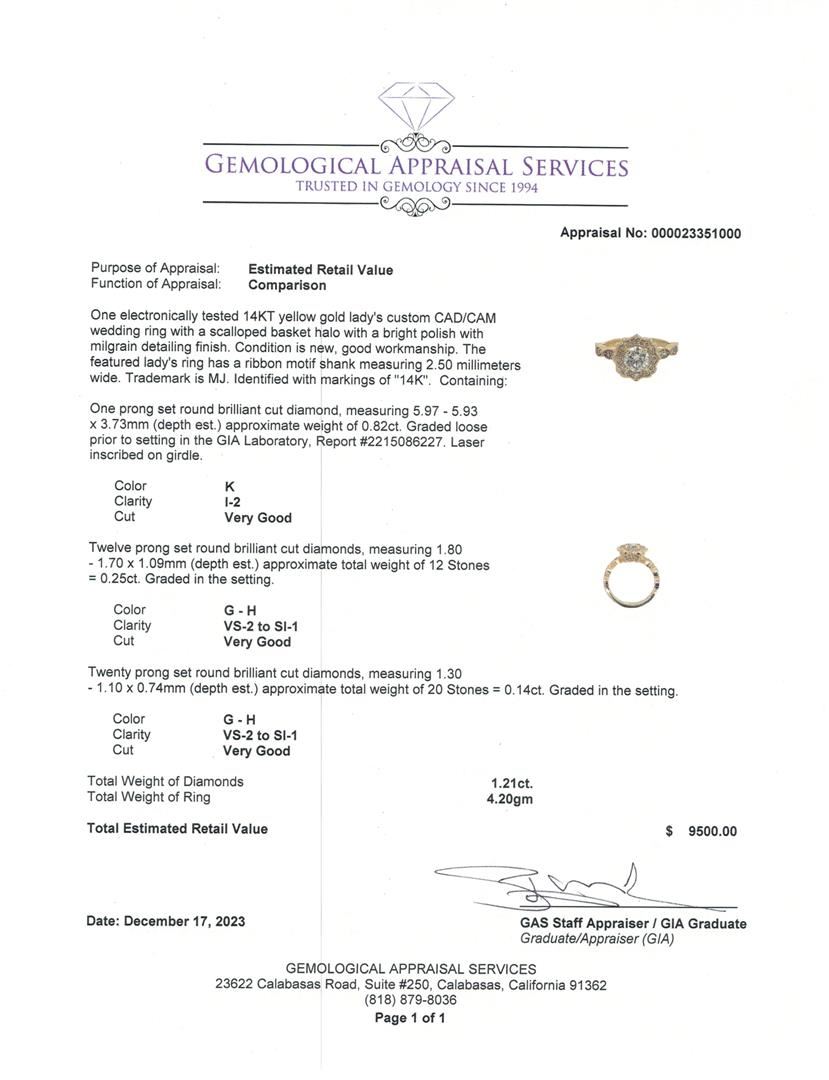 One electronically tested 14KT yellow gold lady's custom CAD/CAM wedding ring with a scalloped basket halo with a bright polish with migraine detailing finish. The featured lady's ring has a ribbon motif shank measuring 2.50 millimeters wide. Trademark is MJ. Identified with markings of "14K". Condition is new, good workmanship. Containing: One prong set round brilliant cut diamond, measuring 5.97 - 5.93 x 3.73mm (depth est.) approximate weight of 0.82ct. Graded loose prior to setting in the GIA Laboratory, Report #2215086227. Laser inscribed on girdle. Color K Clarity I-2 Cut Very Good Twelve prong set round brilliant cut diamonds, measuring 1.80 - 1.70 x 1.09mm (depth est.) approximate total weight of 12 Stones = 0.25ct. Graded in the setting. Color G - H Clarity VS-2 to SI-1 Cut Very Good Twenty prong set round brilliant cut diamonds, measuring 1.30 - 1.10 x 0.74mm (depth est.) approximate total weight of 20 Stones = 0.14ct. Graded in the setting. Color G - H Clarity VS-2 to SI-1 Cut Very Good Total Weight of Diamonds 1.21ct. Total Weight of Ring 4.20gm Estimated Retail Value $ 9500.00