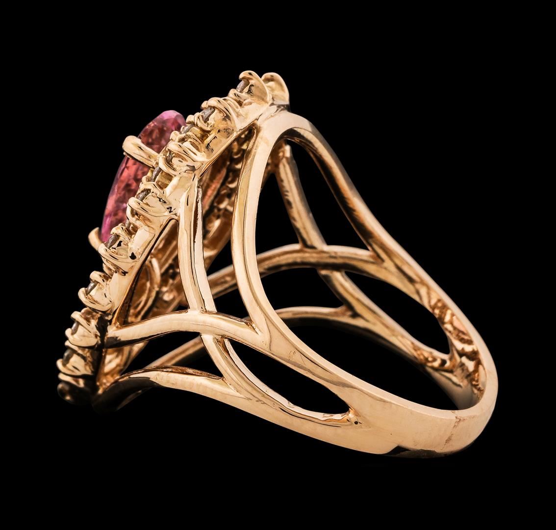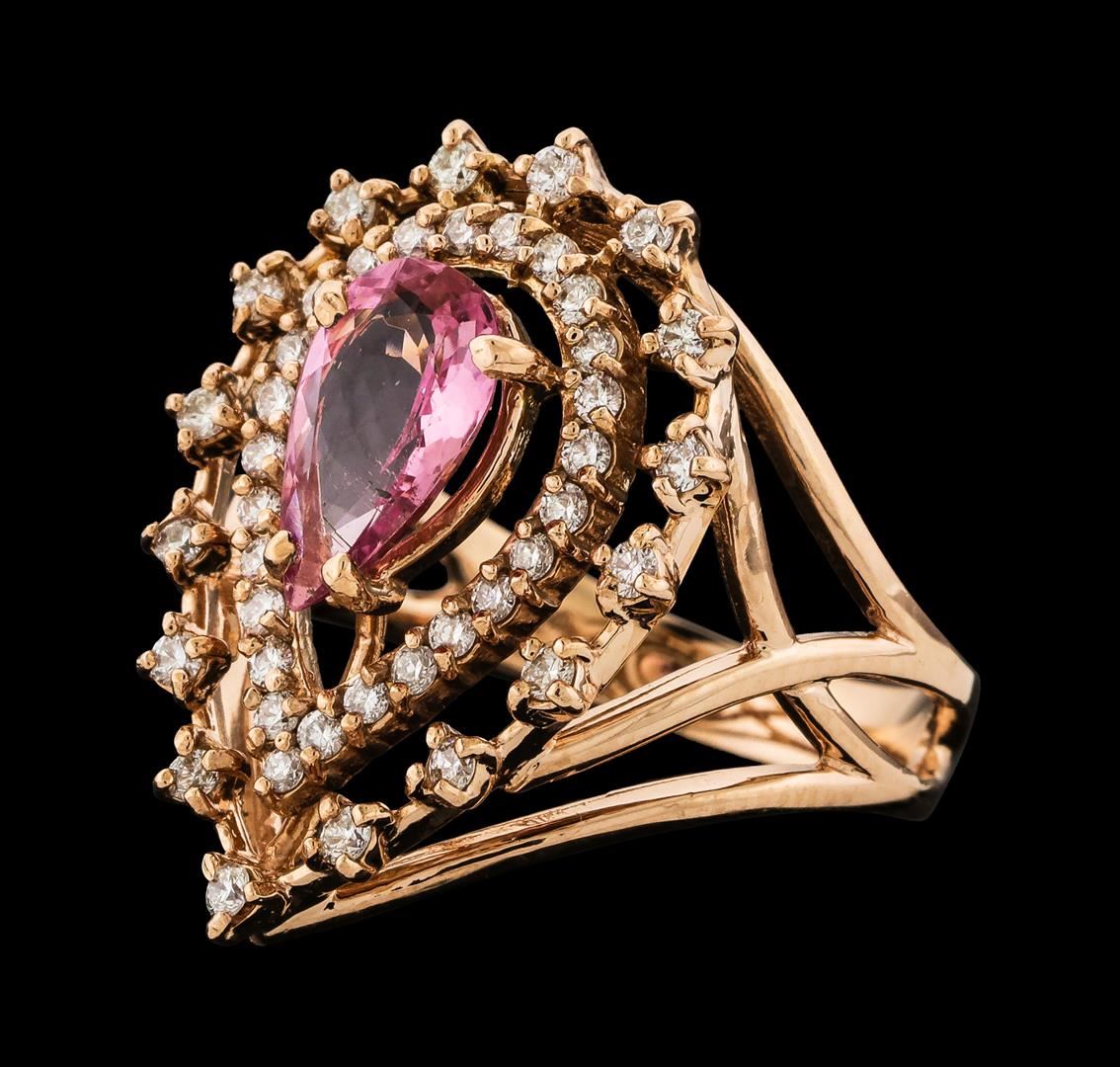 One Pink Tourmaline and Diamond Ring featuring: 14KT Rose Gold with a total weight of 6.25 grams, Pink Tourmaline with a total weight of 1.21ct, and 42 diamonds with a total weight of 0.50ctw.