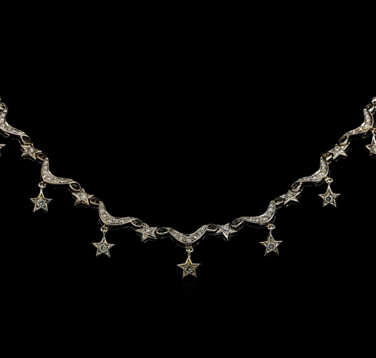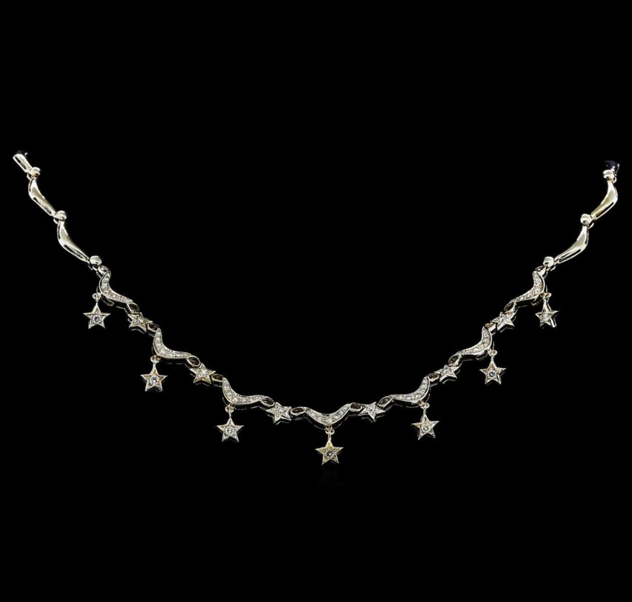 One electronically tested 14KT white gold ladies cast & assembled diamond necklace. Sixteen and one-half inch length necklace features alternating diamond set star and diamond ribbon links with a hanging fringe of diamond set stars, transitioning into scalloped links, terminating in a concealed clasp with safety. Bright polish finish. Condition is good. Containing: Thirteen prong set round brilliant cut diamonds, measuring 2.30 - 2.30 x 1.38mm (depth est.) approximate total weight of 13 Stones = 0.58ct. Clarity SI-1 to I-1. Color: G - I Forty-Nine prong set round brilliant cut diamonds approximate total weight of 49 Stones = 0.64ct. Graded in the setting. Clarity VS-2 to SI-2. Color: G - I. Total Weight of Diamonds 1.22ct.. Total Weight of Necklace 28.78gm. AIG Appraised at $8,940.00.