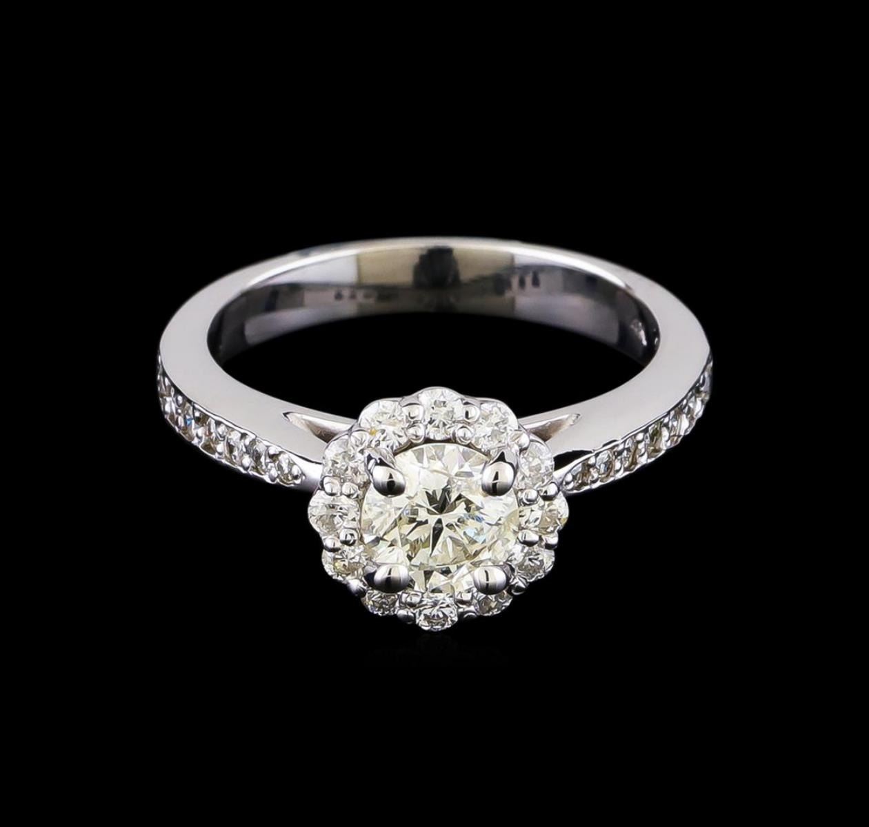 One electronically tested 14KT white gold lady's combination cast & assembled wedding ring with a basket halo with cathedral shank with a bright polish finish. The featured lady's ring has a shank measuring 2.90 millimeters in width. Identified with markings of "14K". Condition is new, good workmanship. Containing: One prong set round brilliant cut diamond, measuring 5.60 - 5.58 x 3.63mm (depth est.) , 3.00.%. GTCF approximate weight of 0.72ct. Graded in the setting. Clarity: I-1. Color: I - Very Good Twelve prong set round brilliant cut diamonds, measuring 1.85 - 1.80 x 1.13mm (depth est.) approximate total weight of 12 Stones = 0.30ct. Graded in the setting. Clarity: SI-1 to SI-2. Color: H - I. Cut Good Fourteen prong set round brilliant cut diamonds, measuring 1.60 - 1.50 x 0.96mm (depth est.) approximate total weight of 14 Stones = 0.20ct. Graded in the setting. Clarity: SI-1 to SI-2. Color: H - I. Cut Good. Total Weight of Diamonds 1.22ct. Total Weight of Ring 3.30gm GAS Appraised at $6,845.00.