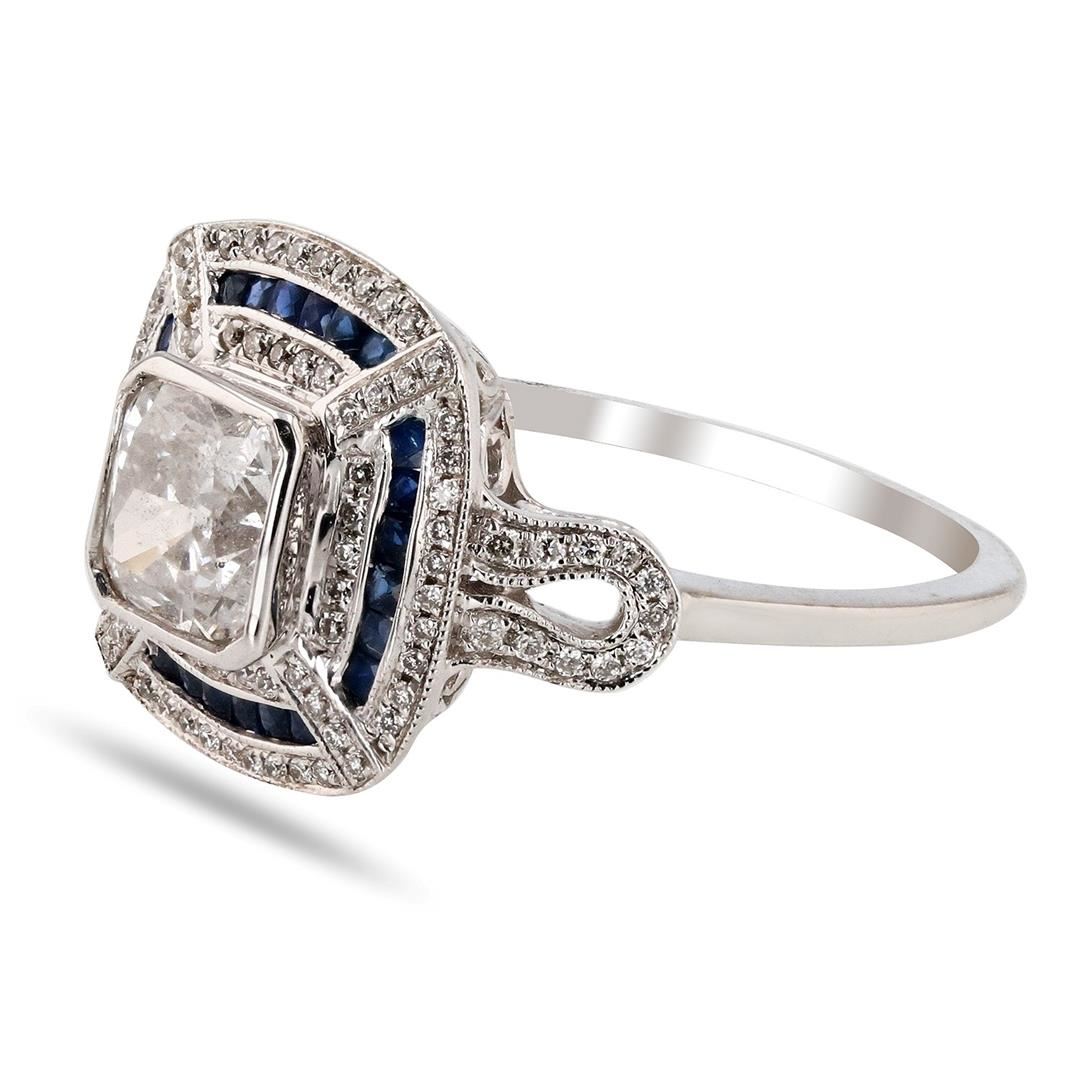One electronically tested 18KT white gold ladies cast diamond & sapphire ring. Condition is new, good workmanship. The featured diamond is set within an elaborate sapphire & diamond bezel, supported by a lattice under gallery, completed by a one millimeter wide band. Bright polish finish with milgrain detailing throughout. Trademark is UCG. Identified with markings of "18K 750". Containing: One bezel set cushion cut diamond, measuring 5.80 x 5.70 x 3.70mm (depth est.) approximate weight of 1.01ct. Graded in the setting. Clarity I-1 Color G Ninety-six bead set round brilliant cut diamonds, measuring 0.90 - 0.70 x 0.52mm (depth est.) approximate total weight of 96 Stones = 0.21ctw. Graded in the setting. Clarity VS-1 to SI-1 Color F - H Twenty-four channel set square cushion cut natural blue sapphires approximate total weight of 0.36ctw., clarity is moderately included, type II, dark, moderately strong, blue color, (GIA B 7/4), cut is good. Transmitting light with no distortion, transparent. Naturally occurring internal & external characteristics are present. Graded in the setting. Total Weight of Colored Stones 0.36ctw. Total Weight of Diamonds 1.22ctw. Total Weight of Ring 4.00 gm