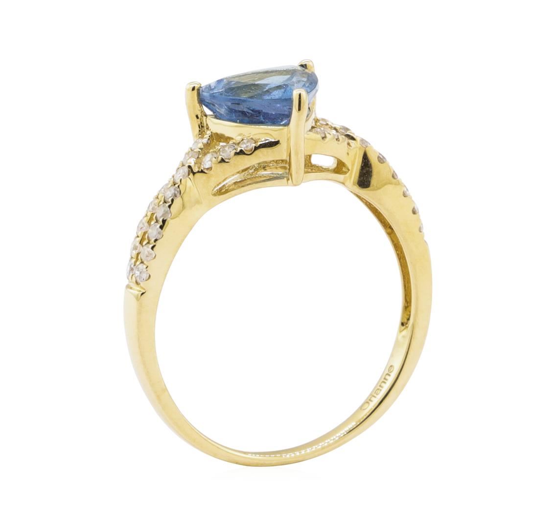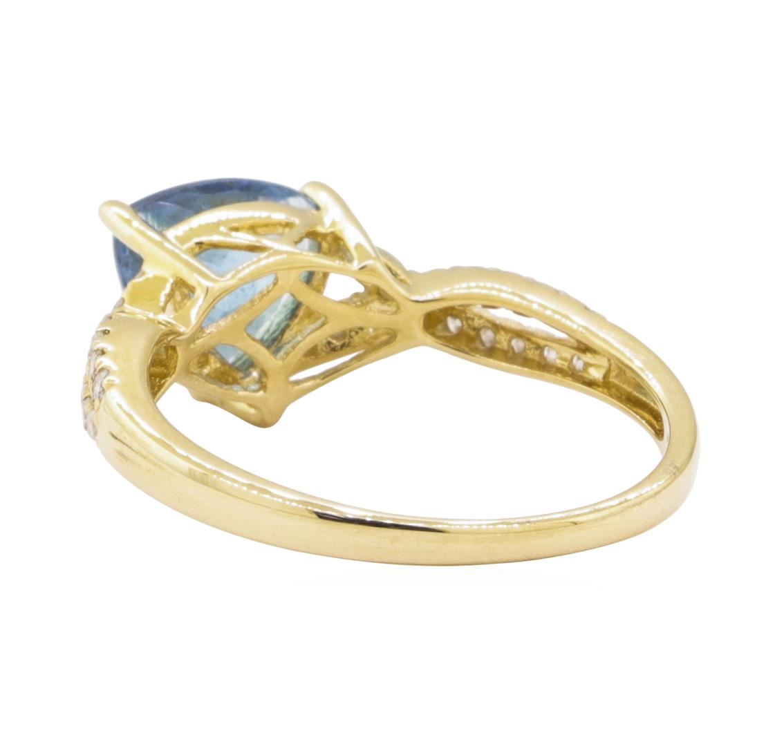 One polished, stamped, and tested 14K yellow gold ring with a bright ?nish. The ring is mounted will: 1 genuine aquamarine center stone weighing approximately 1.23 carat, and 32 genuine round diamonds weighing approximately 0.25 carts. This item weighs 2.4 grams, condition is new, excellent workmanship. MAIN GEMSTONE Species: Natural Beryl Variety : Aquamarine Shape: Triangular Cutting Style: Modi?ed Brilliant Cut Measurements: 704 x 7.2 x 4.4 mm Weight: 1.23 carat Color: Blue Cut Grade: Very Good Refractive Index: 1.577 to 1.583 DR Birefringence: 0,005 - 0.009 Hardness: 7.5 - 8 ADJACENT GEMSTONES ON RING Identity: Natural Diamond Shape: Round Cutting Style: Brilliant Cut Quantity: 32 Diamonds Measurements: 1.2 mm Total Weight: 0.25 carats Color Grade: I - J Clarity Grade: I2 - I3 Refractive Index: 2.418 Hardness: 10 AQUAMARINE WEIGHT: 1.23ct TOTAL DIAMOND WEIGHT: 0.25 cts WEIGHT OF ITEM: 2 4 grams GOLD CONTENT: 14K Yellow Gold ESTIMATED RETAIL REPLACEMENT VALUE: USD $ 2,743.00