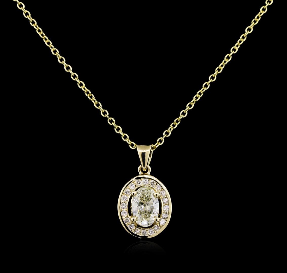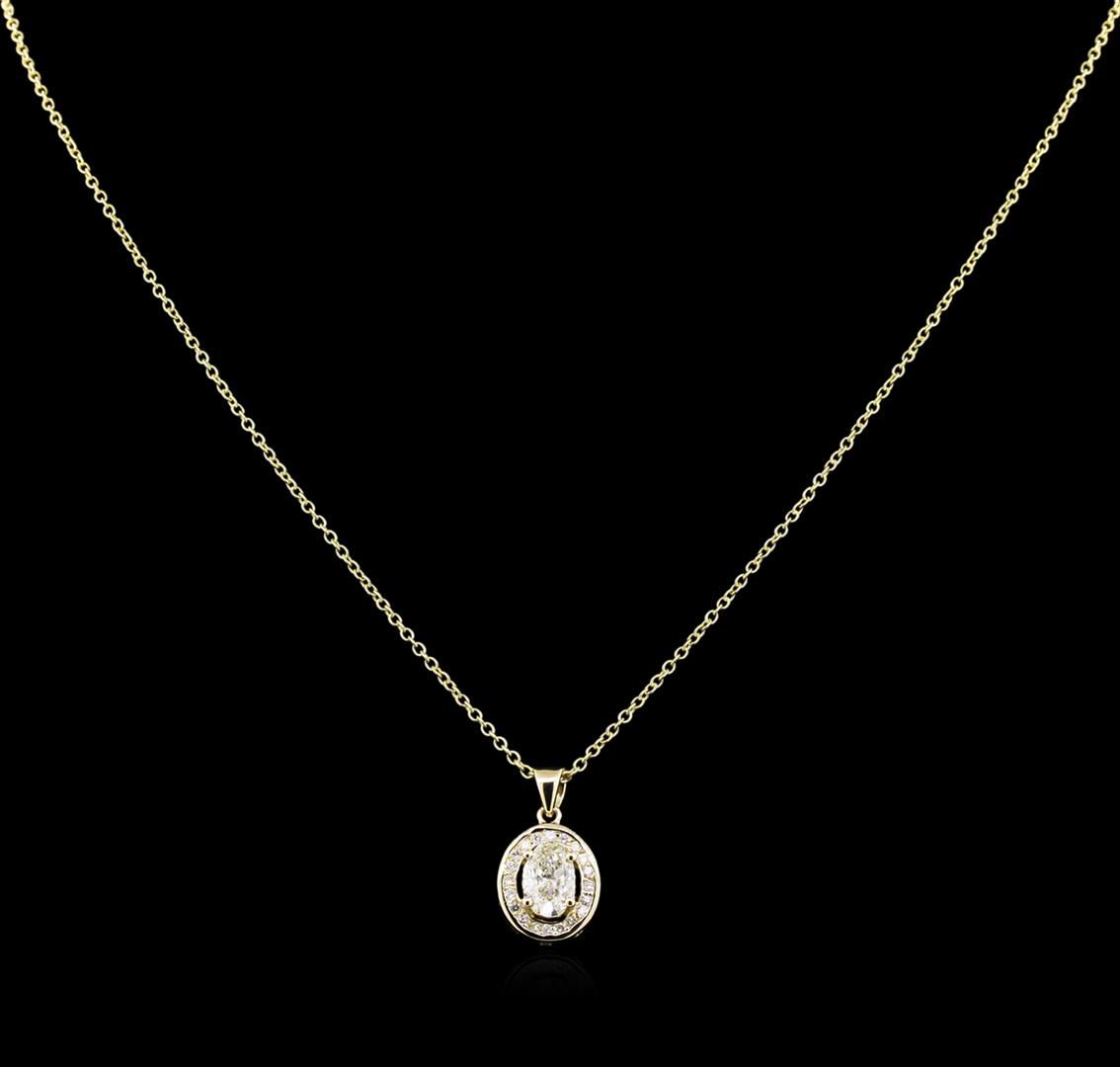 One electronically tested 14KT yellow gold lady's combination cast & assembled fashion pendant & chain 18.0" long, 1.4mm round cable link with a lobster claw clasp with a halo with a bright polish finish. Identified with markings of "K14". Condition is new, good workmanship. Containing: One prong set oval shaped cut diamond, measuring 8.01 x 5.30 x 3.55mm (depth est.) , 5.00.%. GTCF approximate weight of 1.03ct. Graded in the setting. Clarity: I-1. Color: K - L. Cut Very Good Twenty prong set round brilliant cut diamonds, measuring 1.40 - 1.35 x 0.86mm (depth est.) approximate total weight of 20 Stones = 0.20ct. Graded in the setting. Clarity: SI-1 to I-1. Color: H - I. Cut Good. Total Weight of Diamonds 1.23ct. Total Weight of Pendant & Chain 4.10gm. GAS Appraised.