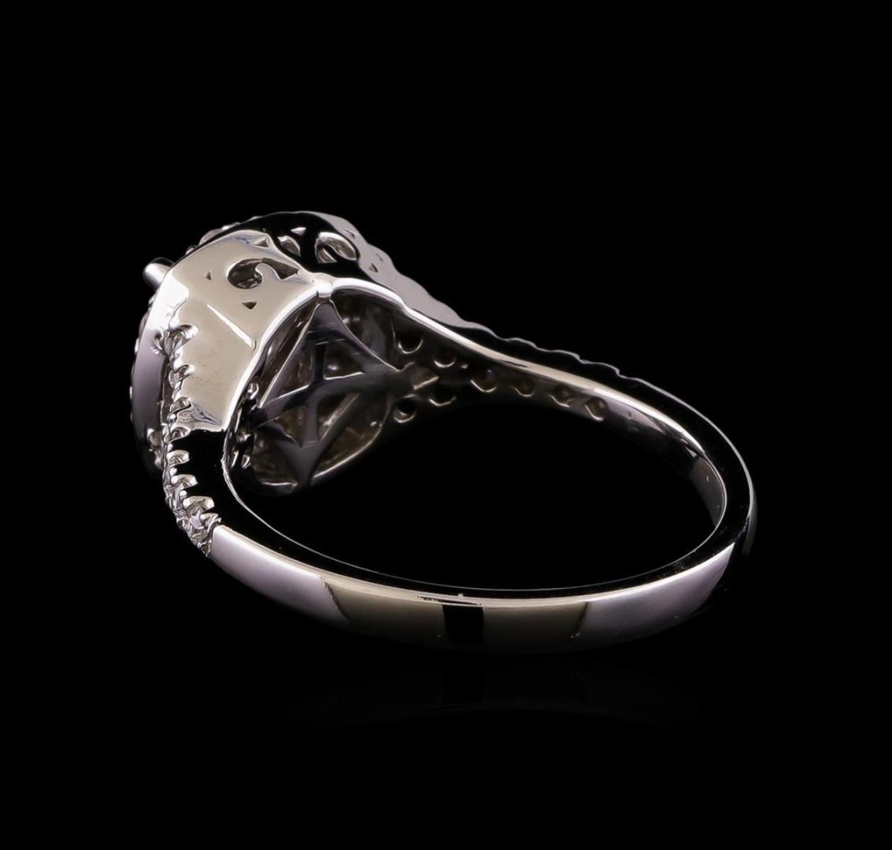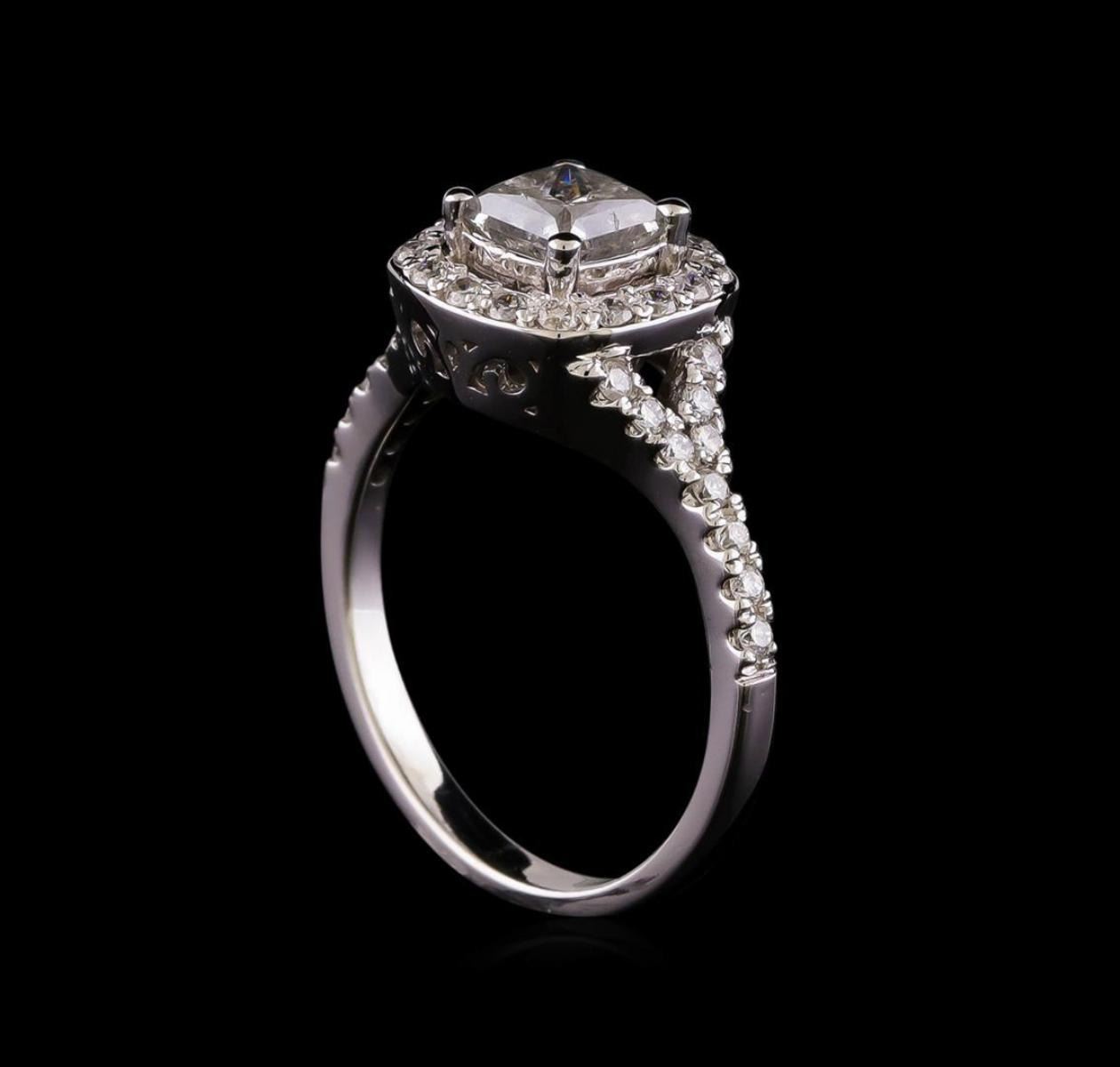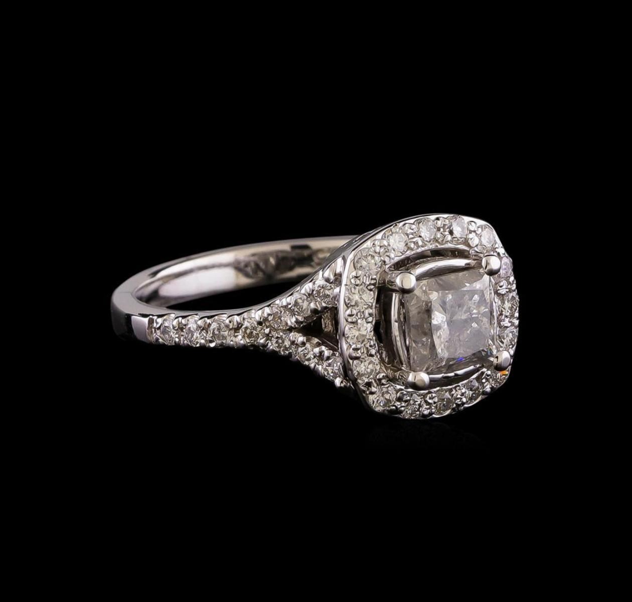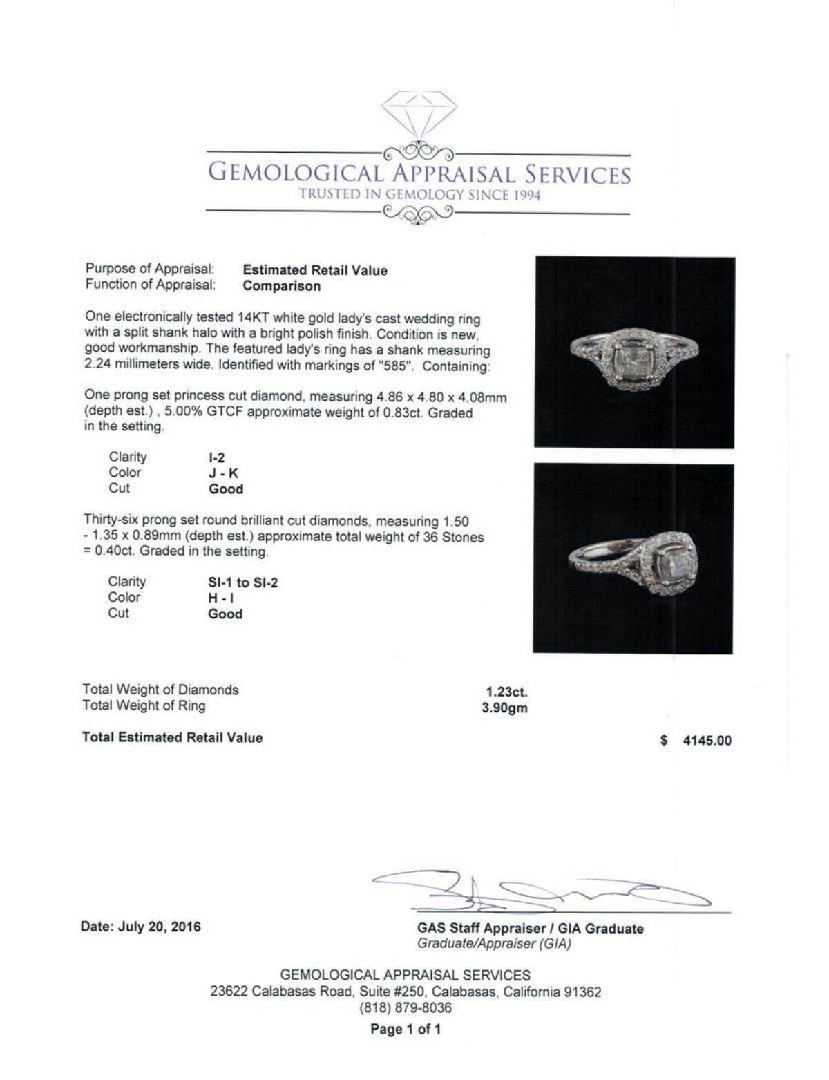 One electronically tested 14KT white gold lady's cast wedding ring with a split shank halo with a bright polish finish. The featured lady's ring has a shank measuring 2.24 millimeters wide. Identified with markings of '585'. Condition is new, good workmanship. Containing: One prong set princess cut diamond, measuring 4.86 x 4.80 x 4.08mm (depth est.) , 5.00.%. GTCF approximate weight of 0.83ct. Graded in the setting. Clarity I-2. Color: J - K Cut Good Thirty-Six prong set round brilliant cut diamonds, measuring 1.50 - 1.35 x 0.89mm (depth est.) approximate total weight of 36 Stones = 0.40ct. Graded in the setting. Clarity SI-1 to SI-2. Color: H - I Cut Good. Total Weight of Diamonds 1.23ct.. Total Weight of Ring 3.90gm. GAS Appraised.
