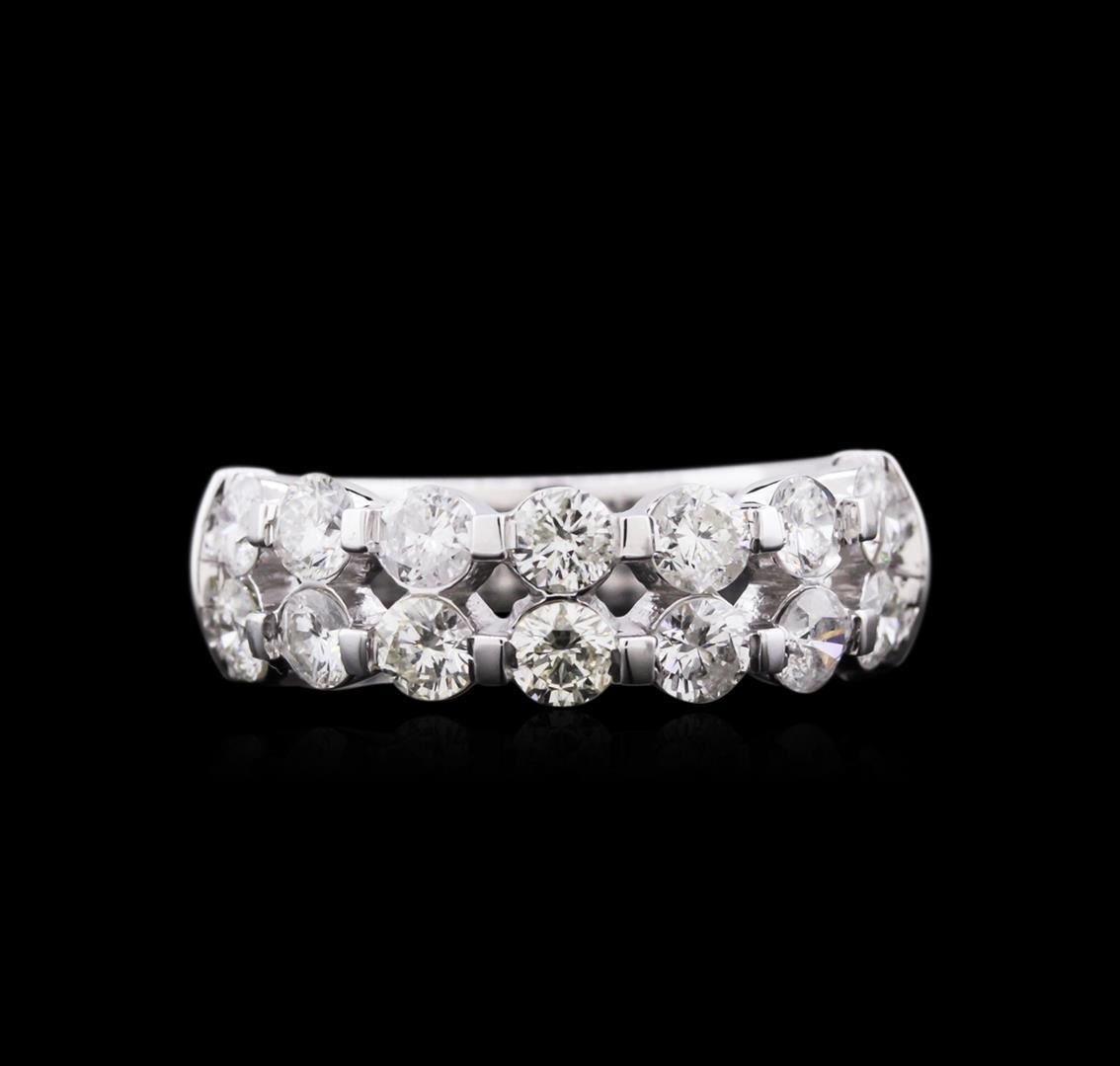 One electronically tested 14KT white gold ladies cast diamond ring with a bright polish finish. Identified with markings of "14K". Condition is new. Containing: Fourteen prong set round brilliant cut diamonds, measuring 3.20 - 3.20 x 1.92mm (depth est.) approximate total weight of 14 Stones = 1.23ct. Clarity: I-1 to I-2. Color: I - J, Cut is Good. Diamonds are graded in the mounting, unless otherwise stated. Total Weight of Diamonds 1.23ct. Total Weight of Ring 6.20 grams. GGL Appraised.