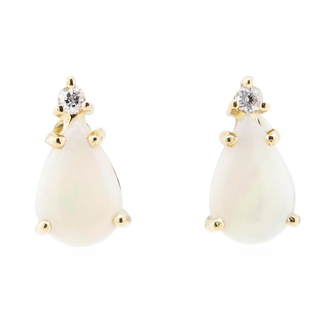 One pair of friction post earrings with baskets featuring: 14KT yellow gold weighing 1.7 grams containing two pear cut opals weighing 1.20ctw and diamonds weighing 0.04ctw.