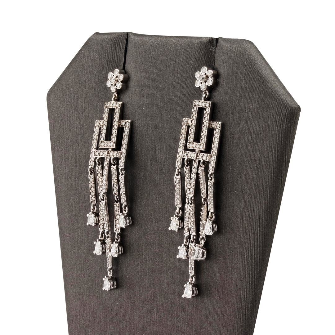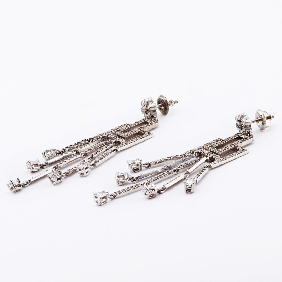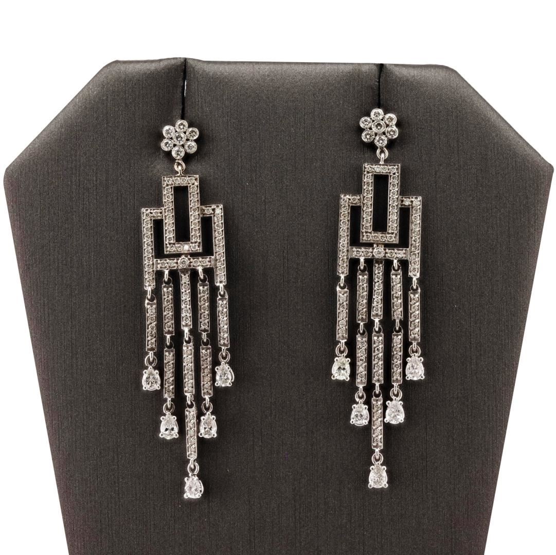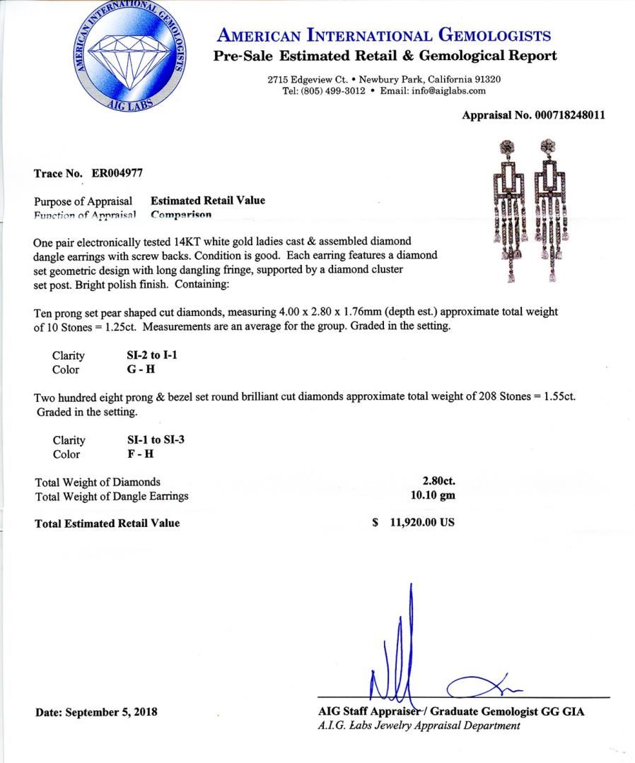 One pair electronically tested 14KT white gold ladies cast & assembled diamond dangle earrings with screw backs. Condition is good. Each earring features a diamond set geometric design with long dangling fringe, supported by a diamond cluster set post. Bright polish finish. Containing: Ten prong set pear shaped cut diamonds, measuring 4.00 x 2.80 x 1.76mm (depth est.) approximate total weight of 10 Stones = 1.25ctw. Measurements are an average for the group. Graded in the setting. Clarity SI2 to I1 Color G - H Two hundred eight prong & bezel set round brilliant cut diamonds approximate total weight of 208 Stones = 1.55ctw. Graded in the setting. Clarity SI1 to SI3 Color F - H Total Weight of Diamonds 2.80ctw. Total Weight of Dangle Earrings 10.10 gm