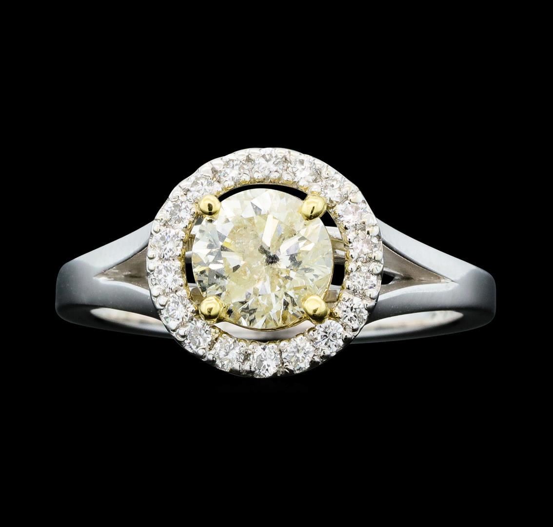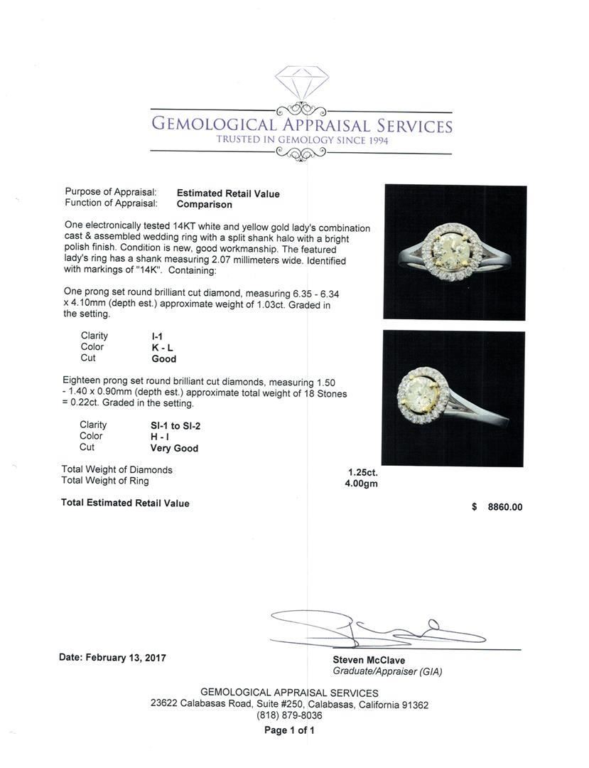 One electronically tested 14KT white and yellow gold lady's combination cast & assembled wedding ring with a split shank halo with a bright polish finish. The featured lady's ring has a shank measuring 2.07 millimeters wide. Identified with markings of '14K'. Condition is new, good workmanship. Containing: One prong set round brilliant cut diamond, measuring 6.35 - 6.34 x 4.10mm (depth est.) approximate weight of 1.03ct. Graded in the setting. Clarity I-1. Color: K - L Cut Good Eighteen prong set round brilliant cut diamonds, measuring 1.50 - 1.40 x 0.90mm (depth est.) approximate total weight of 18 Stones = 0.22ct. Graded in the setting. Clarity SI-1 to SI-2. Color: H - I Cut Very Good. Total Weight of Diamonds 1.25ct.. Total Weight of Ring 4.00gm. GAS Appraised.