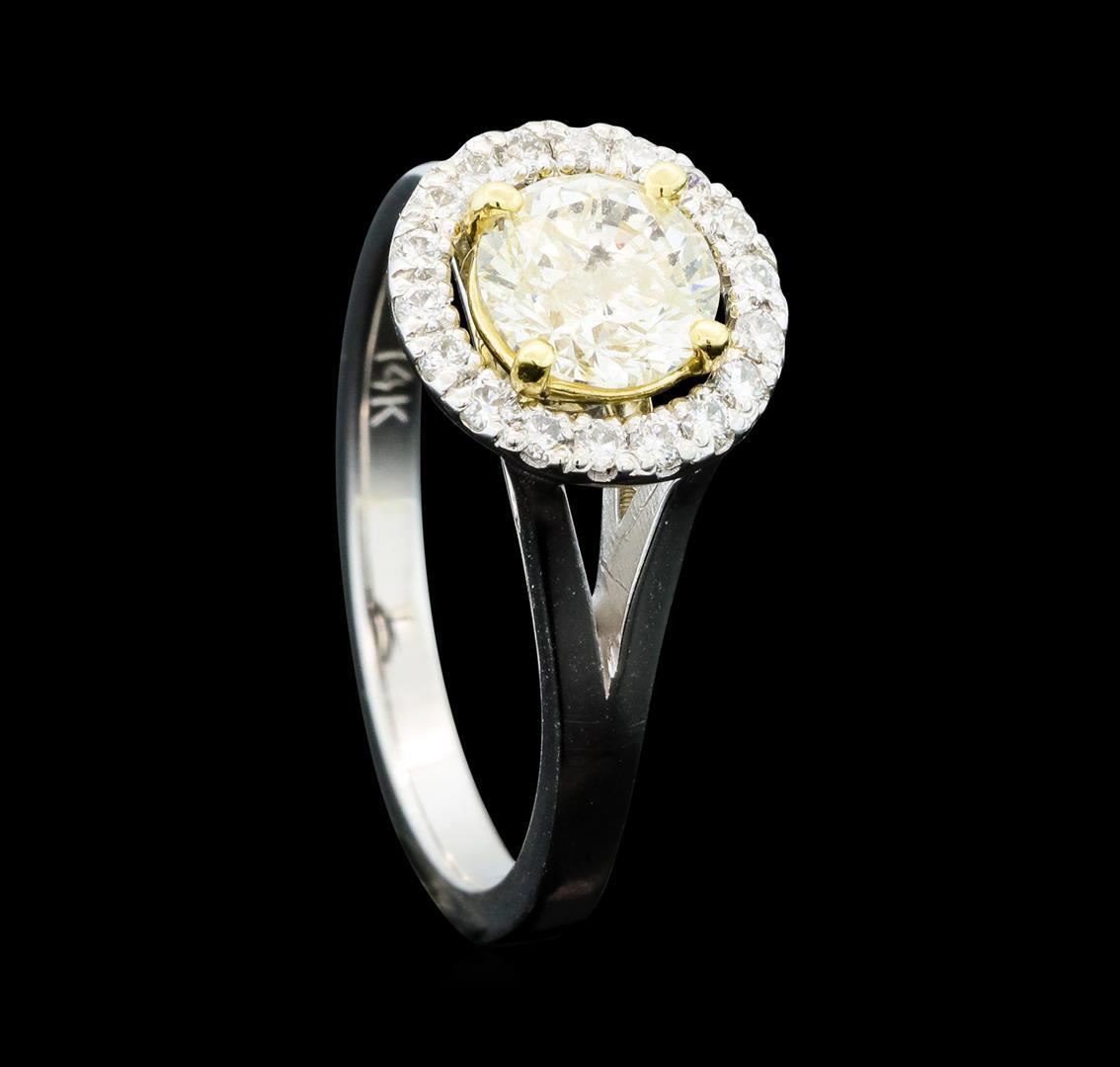 One electronically tested 14KT white and yellow gold lady's combination cast & assembled wedding ring with a split shank halo with a bright polish finish. The featured lady's ring has a shank measuring 2.07 millimeters wide. Identified with markings of '14K'. Condition is new, good workmanship. Containing: One prong set round brilliant cut diamond, measuring 6.35 - 6.34 x 4.10mm (depth est.) approximate weight of 1.03ct. Graded in the setting. Clarity I-1. Color: K - L Cut Good Eighteen prong set round brilliant cut diamonds, measuring 1.50 - 1.40 x 0.90mm (depth est.) approximate total weight of 18 Stones = 0.22ct. Graded in the setting. Clarity SI-1 to SI-2. Color: H - I Cut Very Good. Total Weight of Diamonds 1.25ct.. Total Weight of Ring 4.00gm. GAS Appraised.