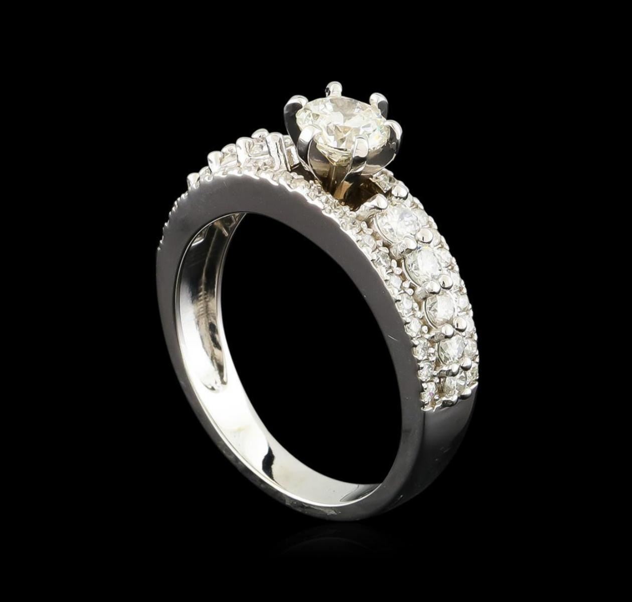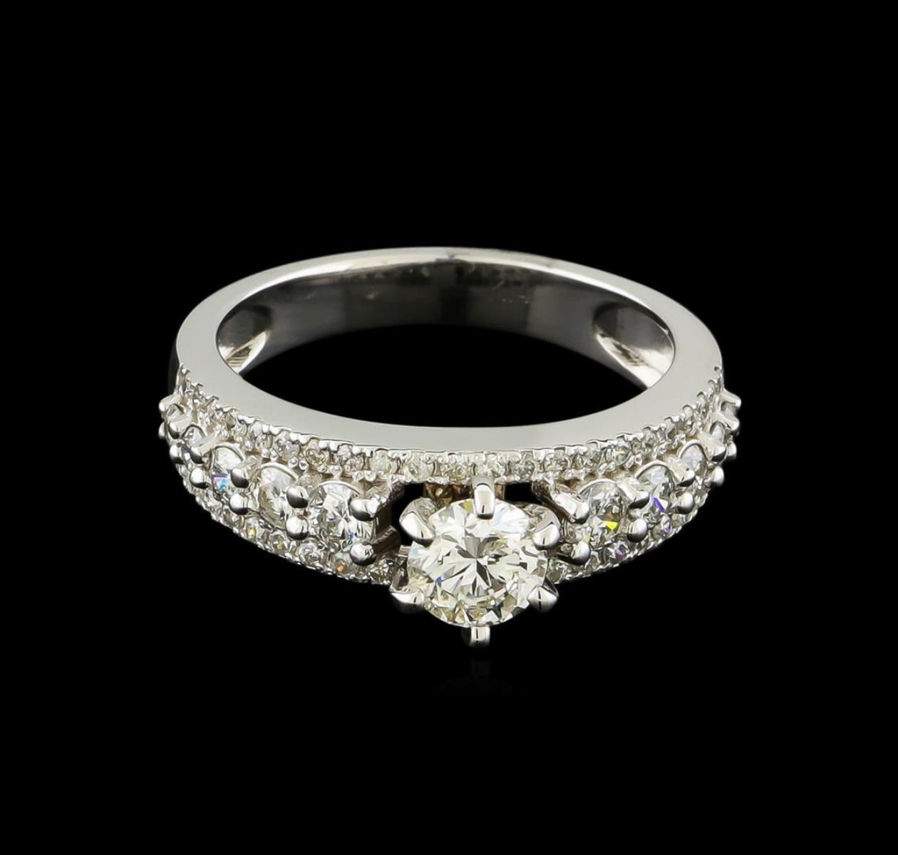One electronically tested 14KT white gold lady's cast wedding ring with a bright polish finish. The featured lady's ring has a shank measuring 3.03 millimeters wide. Identified with markings of "K14". Condition is new, good workmanship. Containing: One prong set round brilliant cut diamond, measuring 5.09 - 5.05 x 3.24mm (depth est.) approximate weight of 0.52ct. Graded in the setting. Clarity: SI-2. Color: Good Ten prong set round brilliant cut diamonds, measuring 2.80 - 1.80 x 1.43mm (depth est.) approximate total weight of 10 Stones = 0.45ct. Graded in the setting. Clarity: SI-1 to SI-2. Color: H - I. Cut Good Forty-Four prong set round brilliant cut diamonds, measuring 1.25 - 1.15 x 0.73mm (depth est.) approximate total weight of 44 Stones = 0.28ct. Graded in the setting. Clarity: SI-1 to I-1. Color: G - Good. Total Weight of Diamonds 1.25ct. Total Weight of Ring 3.90gm. GAS Appraised.