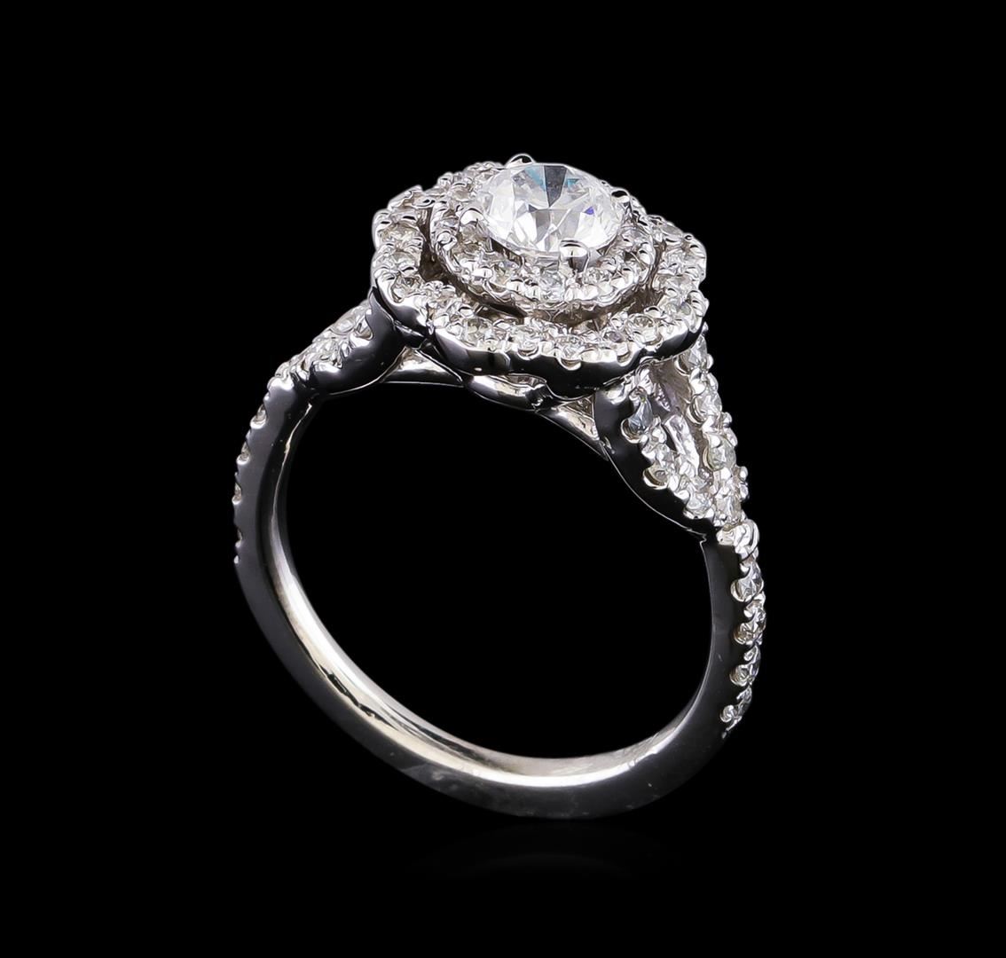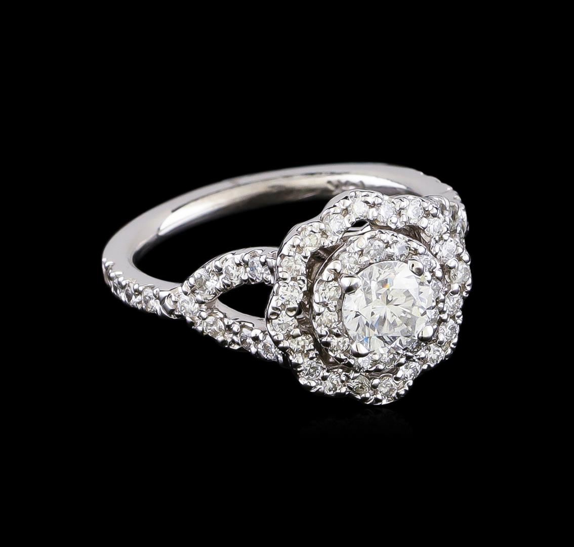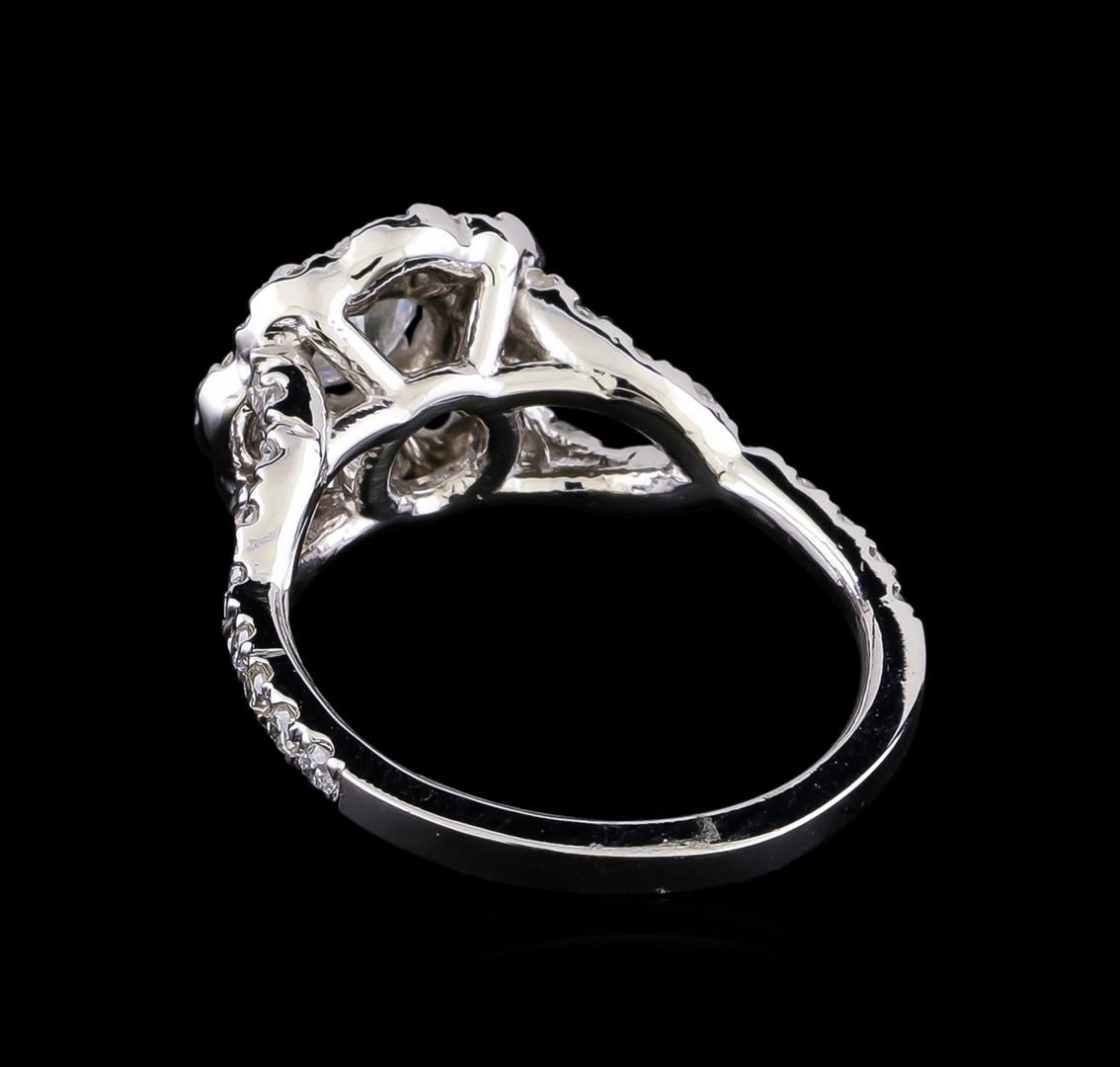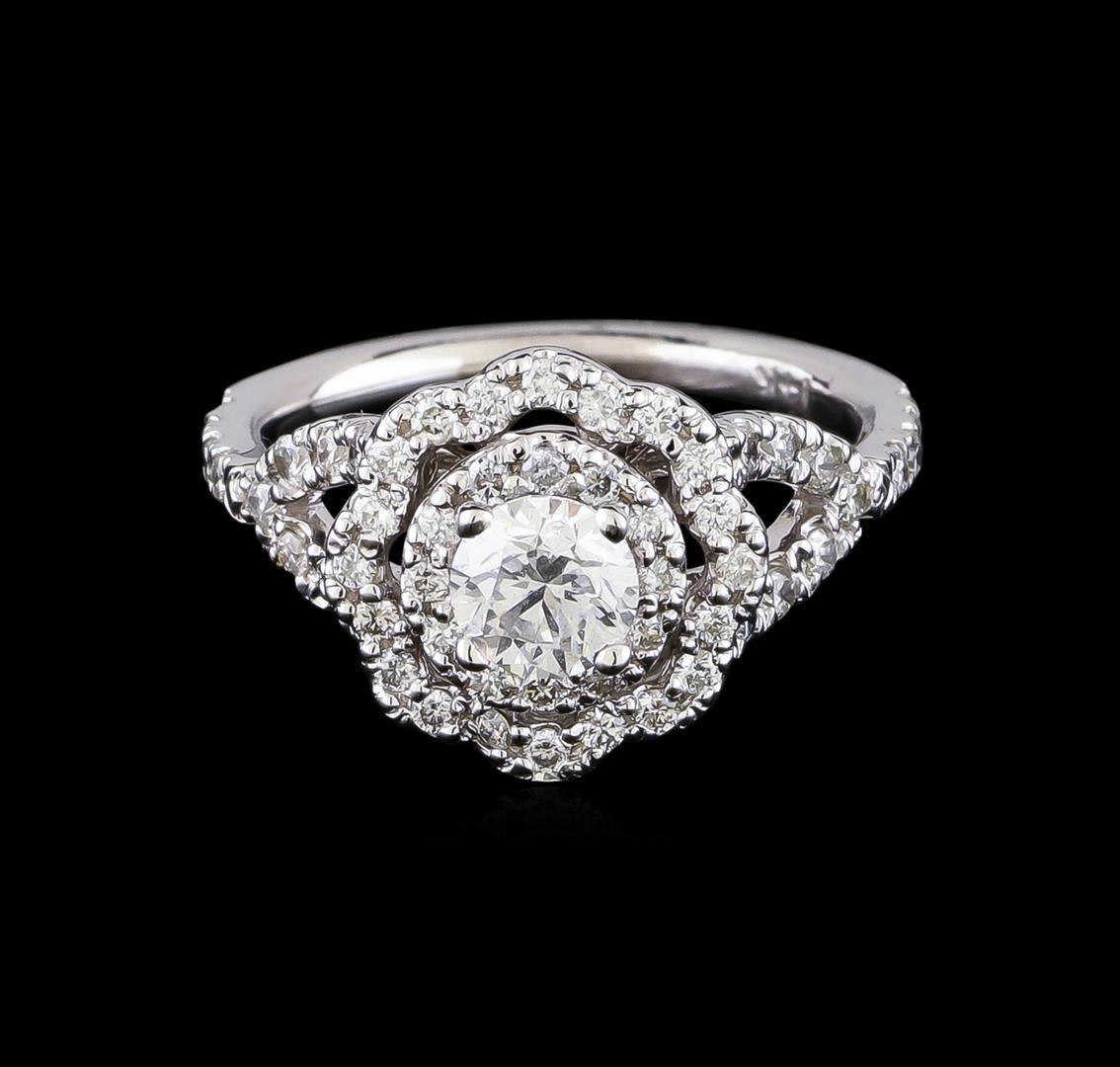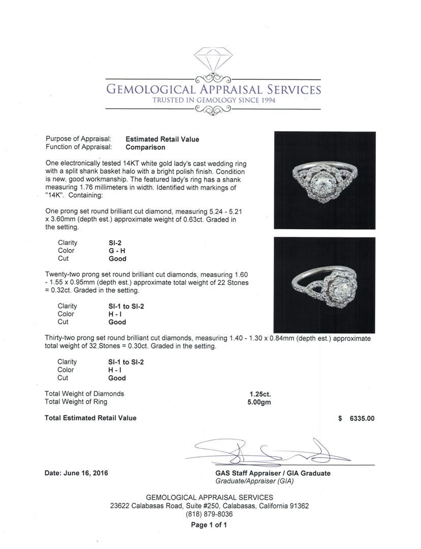 One electronically tested 14KT white gold lady's cast wedding ring with a split shank basket halo with a bright polish finish. The featured lady's ring has a shank measuring 1.76 millimeters in width. Identified with markings of "14K". Condition is new, good workmanship. Containing: One prong set round brilliant cut diamond, measuring 5.24 - 5.21 x 3.60mm (depth est.) approximate weight of 0.63ct. Graded in the setting. Clarity: SI-2. Color: G - Good Twenty-Two prong set round brilliant cut diamonds, measuring 1.60 - 1.55 x 0.95mm (depth est.) approximate total weight of 22 Stones = 0.32ct. Graded in the setting. Clarity: SI-1 to SI-2. Color: H - I. Cut Good Thirty-Two prong set round brilliant cut diamonds, measuring 1.40 - 1.30 x 0.84mm (depth est.) approximate total weight of 32 Stones = 0.30ct. Graded in the setting. Clarity: SI-1 to SI-2. Color: H - I. Cut Good. Total Weight of Diamonds 1.25ct. Total Weight of Ring 5.00gm GAS Appraised.