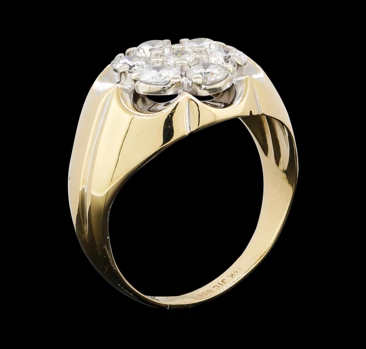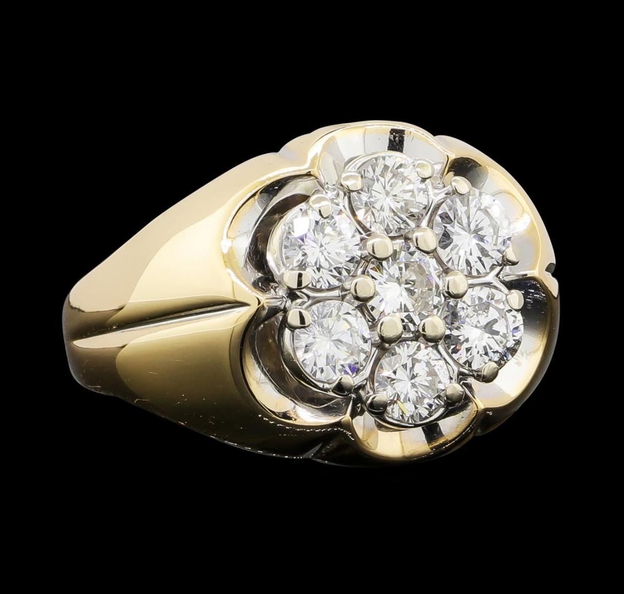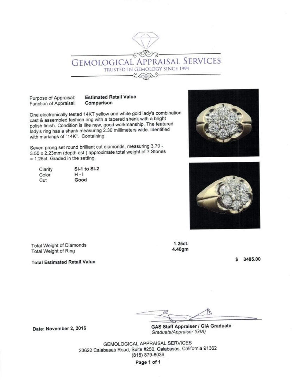 One electronically tested 14KT yellow and white gold lady's combination cast & assembled fashion ring with a tapered shank with a bright polish finish. The featured lady's ring has a shank measuring 2.30 millimeters wide. Identified with markings of '14K'. Condition is like new, good workmanship. Containing: Seven prong set round brilliant cut diamonds, measuring 3.70 - 3.50 x 2.23mm (depth est.) approximate total weight of 7 Stones = 1.25ct. Graded in the setting. Clarity SI-1 to SI-2. Color: H - I Cut Good. Total Weight of Diamonds 1.25ct.. Total Weight of Ring 4.40gm. GAS Appraised.