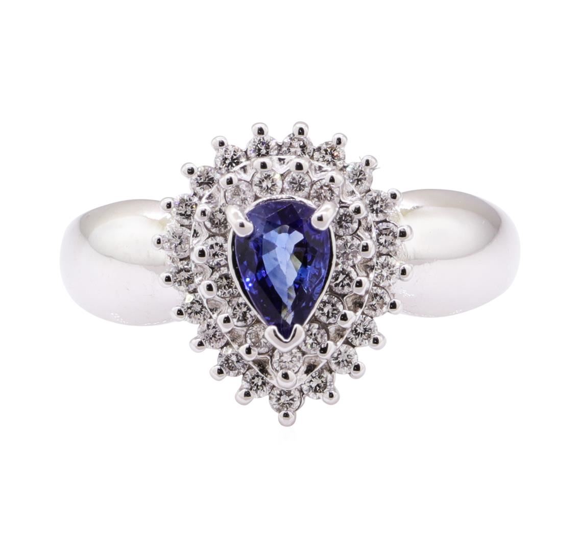 One cluster ring featuring: 14KT white gold weighing 6.6 grams containing one pear shaped blue sapphire weighing 0.66ct and diamonds weighing 0.60ctw. The ring has a double halo cluster motif.
