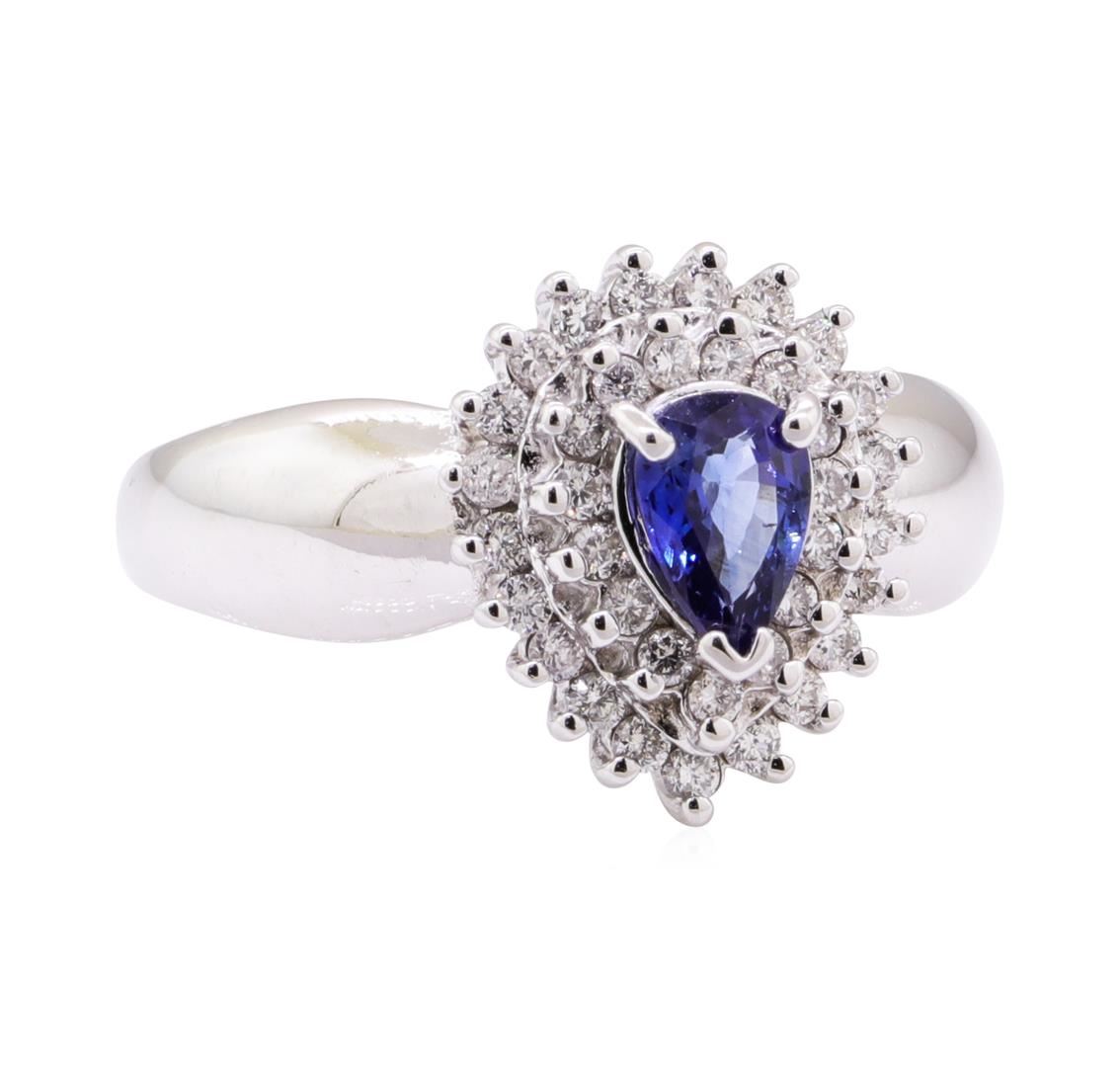 One cluster ring featuring: 14KT white gold weighing 6.6 grams containing one pear shaped blue sapphire weighing 0.66ct and diamonds weighing 0.60ctw. The ring has a double halo cluster motif.