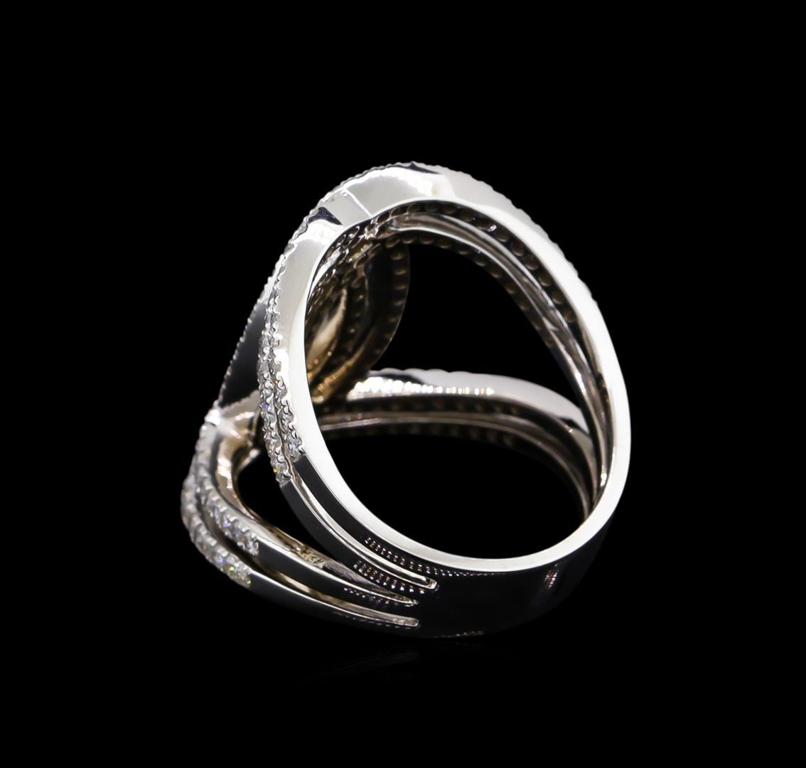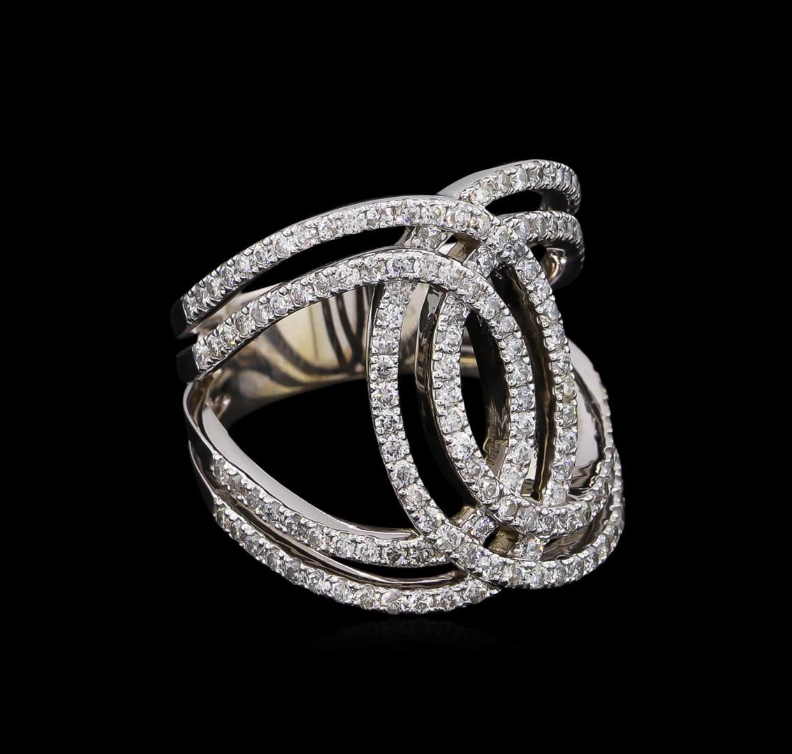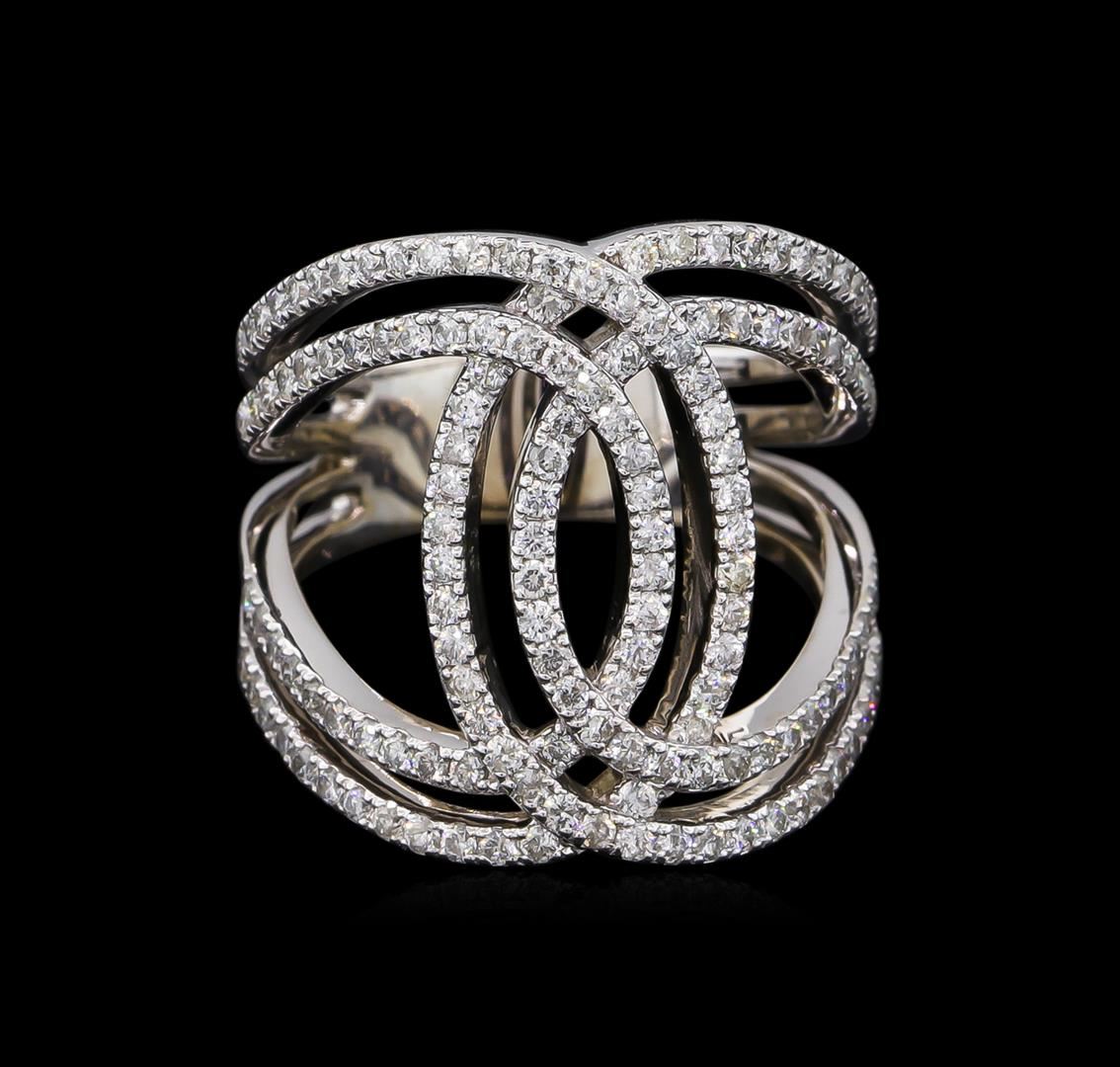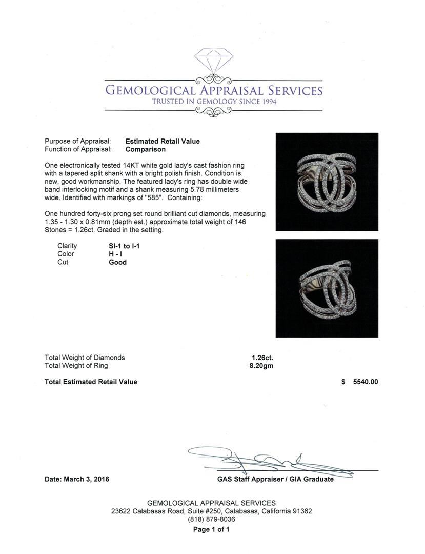 One electronically tested 14KT white gold lady's cast fashion ring with a tapered split shank with a bright polish finish. The featured lady's ring has double wide band interlocking motif and a shank measuring 5.78 millimeters wide. Identified with markings of "585". Condition is new, good workmanship. Containing: One Hundred Forty-Six prong set round brilliant cut diamonds, measuring 1.35 - 1.30 x 0.81mm (depth est.) approximate total weight of 146 Stones = 1.26ct. Graded in the setting. Clarity: SI-1 to I-1. Color: H - I. Cut Good. Total Weight of Diamonds 1.26ct. Total Weight of Ring 8.20gm. GAS Appraised at $5,540.00.