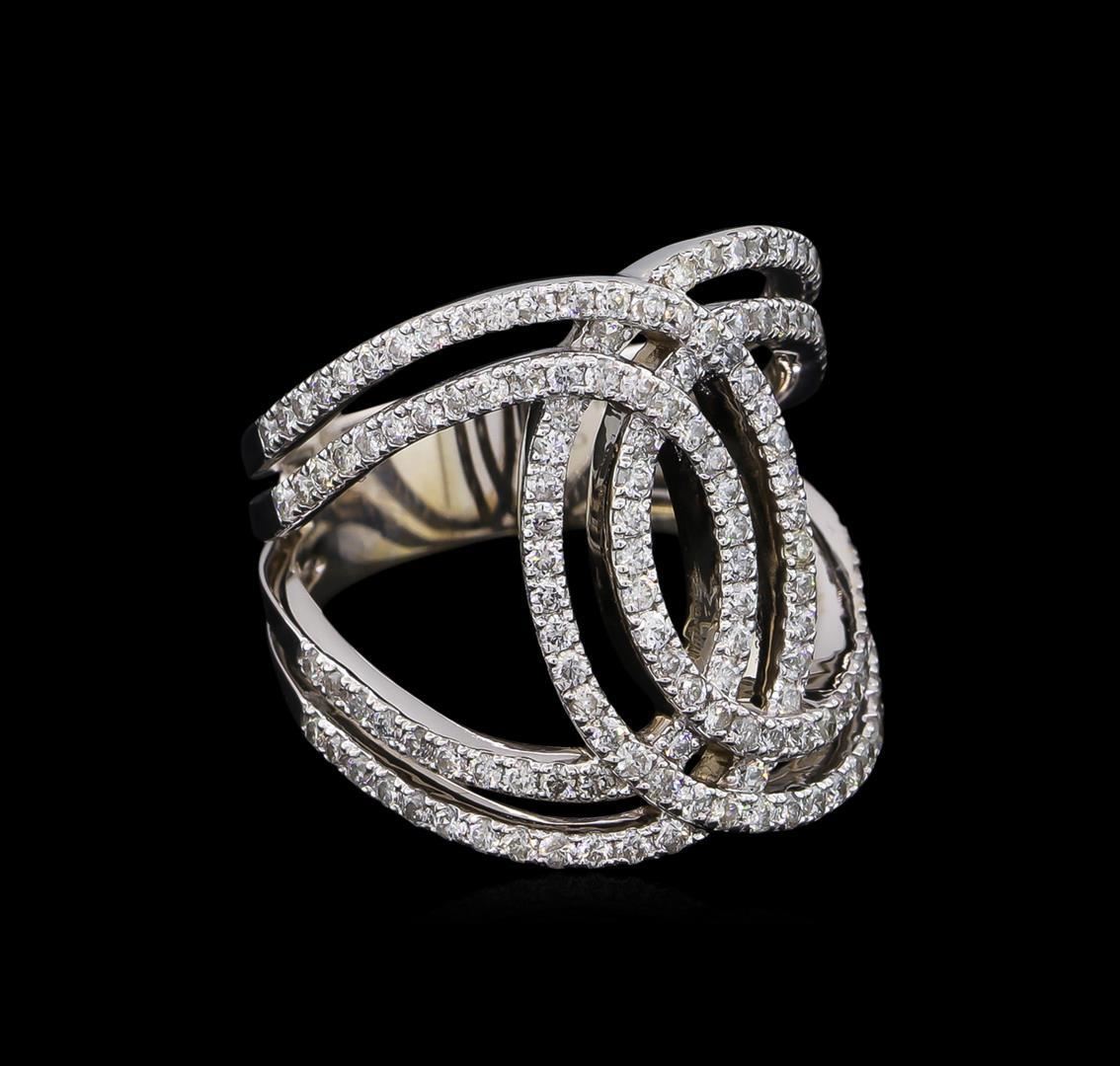One electronically tested 14KT white gold lady's cast fashion ring with a tapered split shank with a bright polish finish. The featured lady's ring has double wide band interlocking motif and a shank measuring 5.78 millimeters wide. Identified with markings of "585". Condition is new, good workmanship. Containing: One Hundred Forty-Six prong set round brilliant cut diamonds, measuring 1.35 - 1.30 x 0.81mm (depth est.) approximate total weight of 146 Stones = 1.26ct. Graded in the setting. Clarity: SI-1 to I-1. Color: H - I. Cut Good. Total Weight of Diamonds 1.26ct. Total Weight of Ring 8.20gm. GAS Appraised.