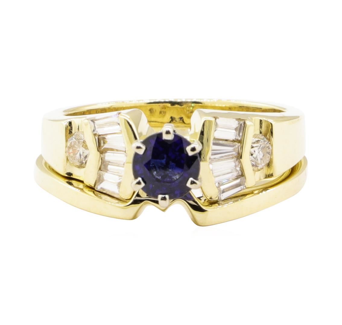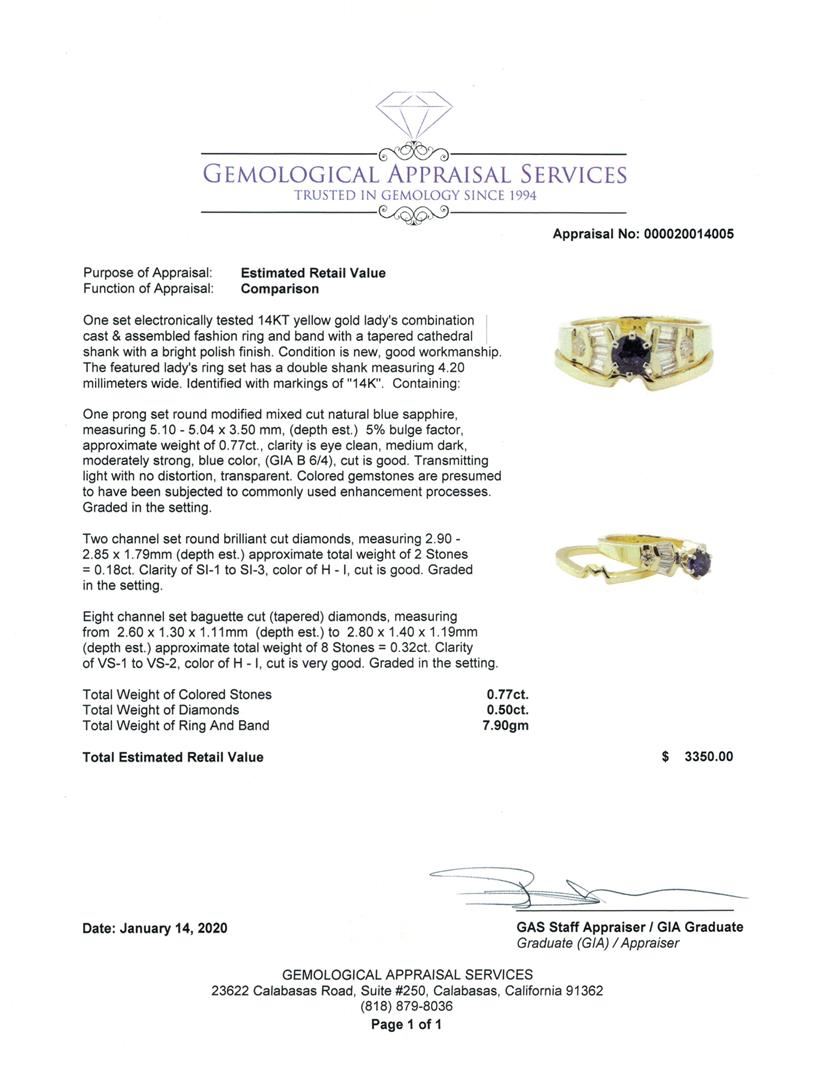 One set electronically tested 14KT yellow gold lady's combination cast & assembled fashion ring and band with a tapered cathedral shank with a bright polish finish. The featured lady's ring set has a double shank measuring 4.20 millimeters wide. Identified with markings of '14K'. Condition is new, good workmanship. Containing: One prong set round modified mixed cut natural blue sapphire, measuring 5.10 - 5.04 x 3.50 mm, (depth est.) 5%. bulge factor, approximate weight of 0.77ct., clarity is eye clean, medium dark, moderately strong, blue color, (GIA B 6/4), cut is good. Transmitting light with no distortion, transparent. Colored gemstones are presumed to have been subjected to commonly used enhancement processes. Graded in the setting. Two channel set round brilliant cut diamonds, measuring 2.90 - 2.85 x 1.79mm (depth est.) approximate total weight of 2 Stones = 0.18ct. Graded in the setting. Color H - I Clarity SI-1 to SI-3 Cut Good Eight channel set baguette cut (tapered) diamonds, measuring from 2.60 x 1.30 x 1.11mm (depth est.) to 2.80 x 1.40 x 1.19mm (depth est.) approximate total weight of 8 Stones = 0.32ct. Graded in the setting. Color H - I Clarity VS-1 to VS-2 Cut Very Good. Total Weight of Colored Stones 0.77ct.. Total Weight of Diamonds 0.50ct.. Total Weight of Ring And Band 7.90gm GAS Appraised at $3350.00. GAS Appraised.