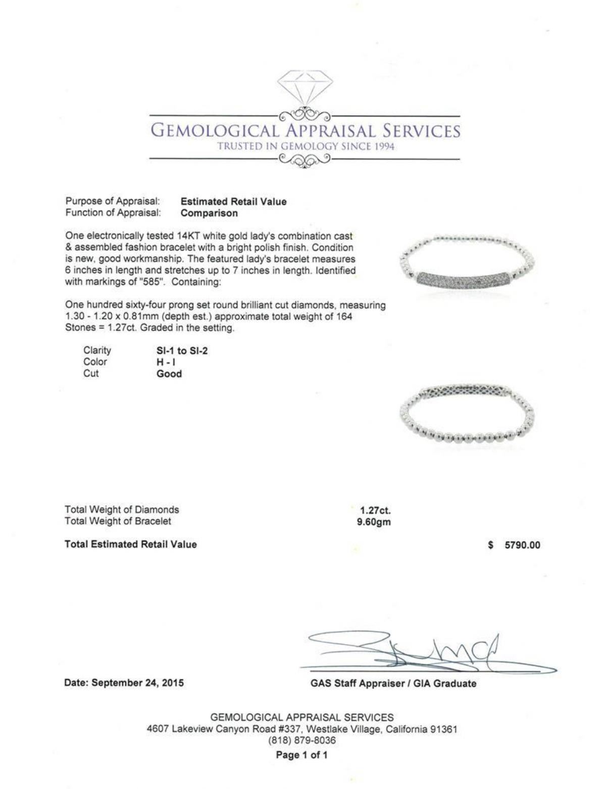 One electronically tested 14KT white gold lady's combination cast & assembled fashion bracelet with a bright polish finish. The featured lady's bracelet measures 6 inches in length and stretches up to 7 inches in length. Identified with markings of "585". Condition is new, good workmanship. Containing: One Hundred Sixty-Four prong set round brilliant cut diamonds, measuring 1.30 - 1.20 x 0.81mm (depth est.) approximate total weight of 164 Stones = 1.27ct. Graded in the setting. Clarity: SI-1 to SI-2. Color: H - I. Cut Good. Total Weight of Diamonds 1.27ct. Total Weight of Bracelet 9.60gm at $5790.00.. GAS Appraised.