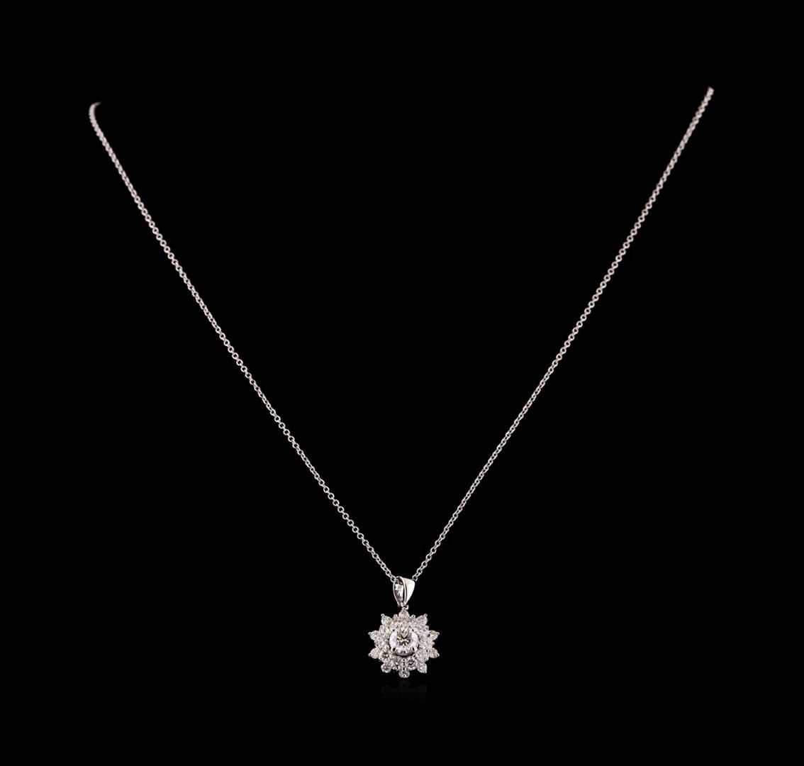 One electronically tested 14KT white gold lady's combination cast & assembled fashion pendant & chain 18.0' long, 1.3mm round cable link with a lobster claw clasp with a bright polish finish. Identified with markings of '14K'. Condition is new, good workmanship. Containing: One prong set round brilliant cut diamond, measuring 5.10 - 5.05 x 3.40mm (depth est.) approximate weight of 0.55ct. Graded in the setting. Clarity VS-2. Color: I - J Cut Good Ten prong set round brilliant cut diamonds, measuring 2.45 - 2.35 x 1.49mm (depth est.) approximate total weight of 10 Stones = 0.52ct. Graded in the setting. Clarity SI-1 to I-1. Color: G - H Cut Good Ten prong set round brilliant cut diamonds, measuring 1.80 - 1.70 x 1.09mm (depth est.) approximate total weight of 10 Stones = 0.20ct. Graded in the setting. Clarity SI-1 to SI-2. Color: H - I Cut Good. Total Weight of Diamonds 1.27ct.. Total Weight of Pendant & Chain 3.90gm. GAS Appraised at $6,230.00.