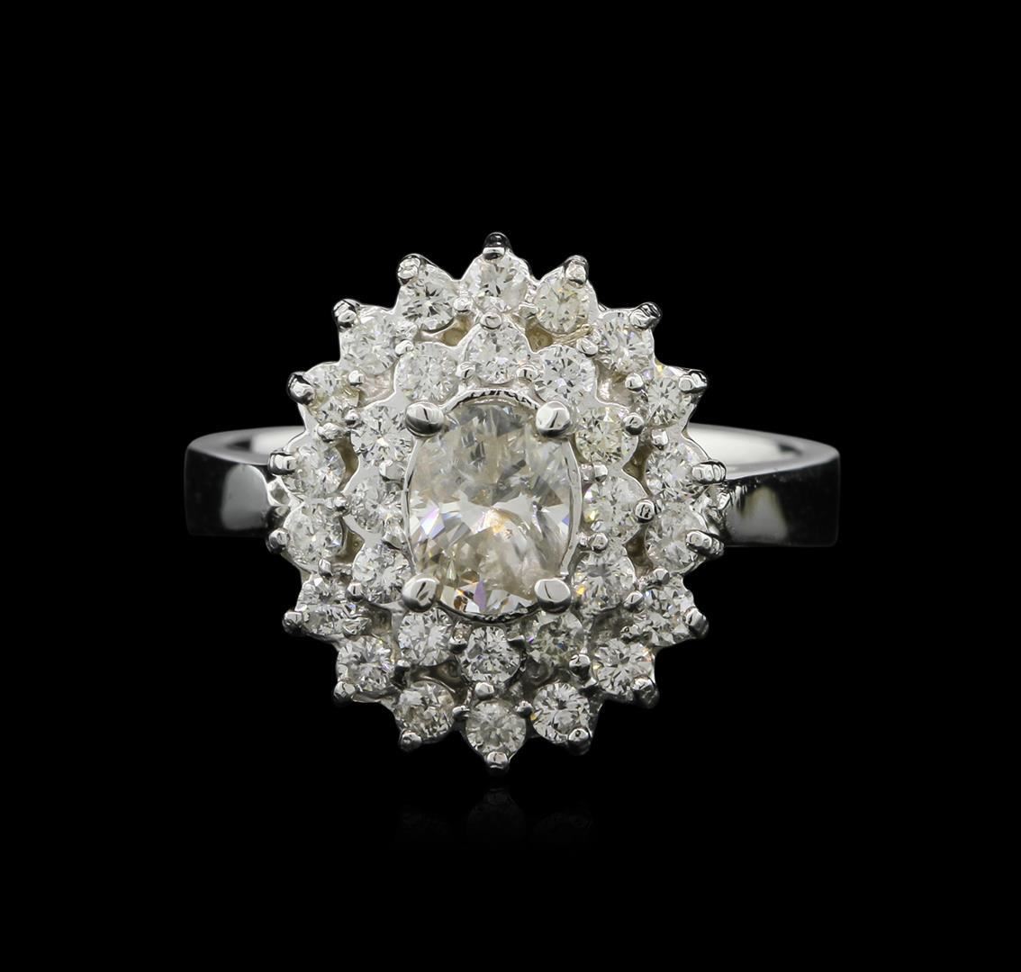 One electronically tested 14KT white gold ladies cast diamond ring with a bright polish finish. The featured diamond is set within stylized diamond floret bezels, completed by a three millimeter wide band. Identified with markings of "K14". Condition is new, good workmanship. Containing: One prong set oval shaped cut diamond, measuring 5.90 x 4.50 x 3.00mm (depth est.), 8.00.%. GTCF approximate weight of 0.65ct. Graded in the setting. Clarity I-2 Color J. Depth 66.7%. Table 57.8%. Thirty prong set round brilliant cut diamonds (depth est.) approximate total weight of 30 Stones = 0.62ct. Graded in the setting. Clarity I-1 to I-2 Color G - I. Total Weight of Diamonds 1.27ct. Total Weight of Ring 6.08 grams. AIG Appraised.