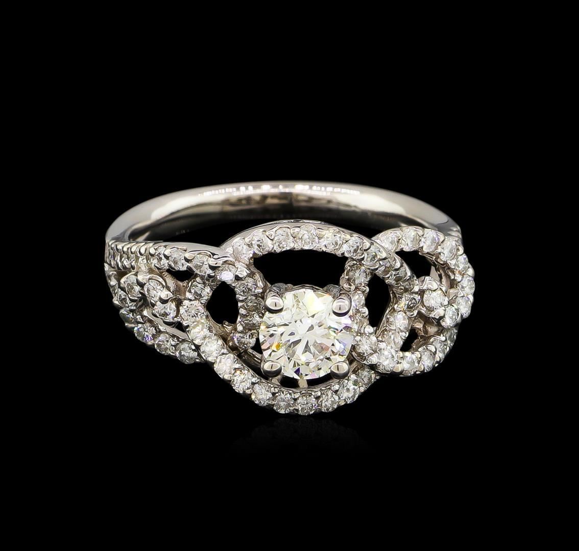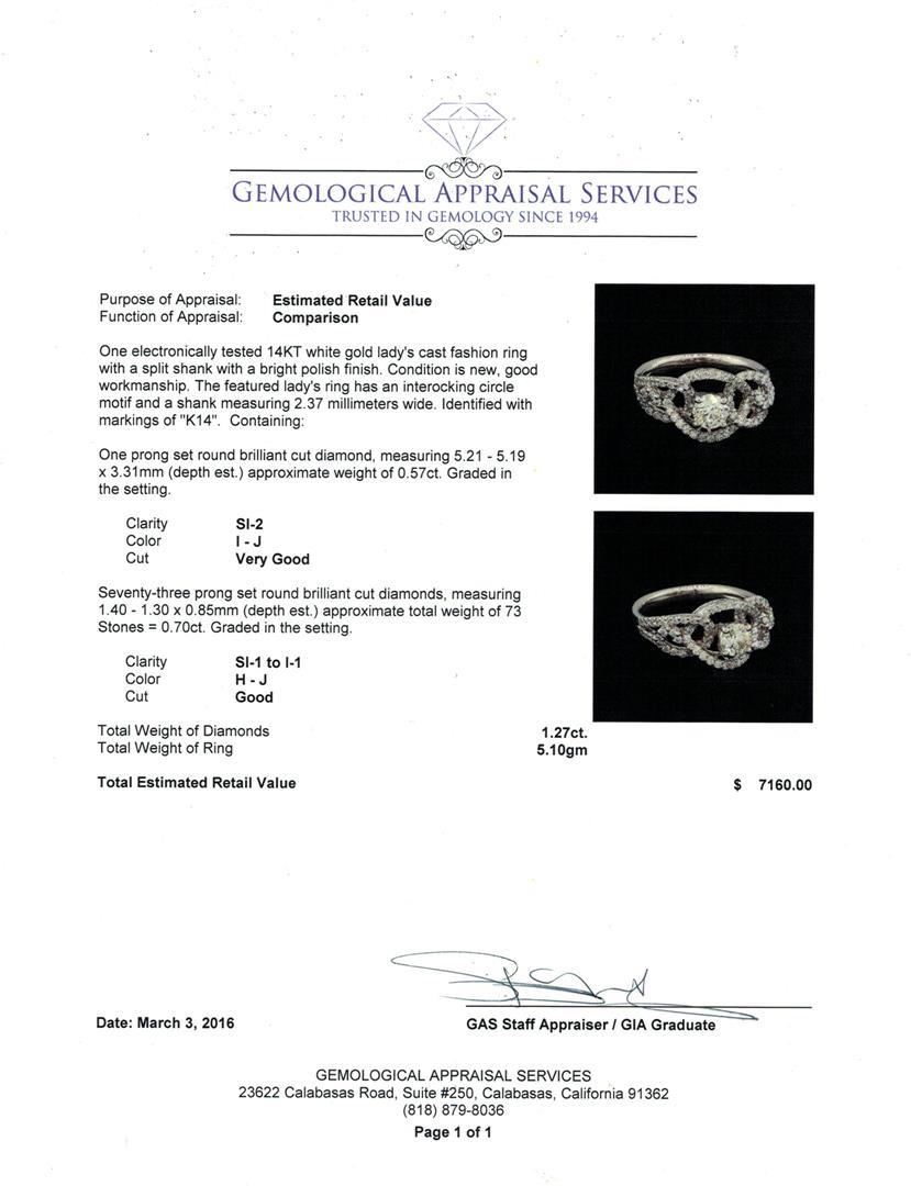 One electronically tested 14KT white gold lady's cast fashion ring with a split shank with a bright polish finish. The featured lady's ring has an interlocking circle motif and a shank measuring 2.37 millimeters wide. Identified with markings of "K14". Condition is new, good workmanship. Containing: One prong set round brilliant cut diamond, measuring 5.21 - 5.19 x 3.31mm (depth est.) approximate weight of 0.57ct. Graded in the setting. Clarity: SI-2. Color: I - J. Cut Very Good Seventy-Three prong set round brilliant cut diamonds, measuring 1.40 - 1.30 x 0.85mm (depth est.) approximate total weight of 73 Stones = 0.70 ct. Graded in the setting. Clarity: SI-1 to I-1. Color: H - Good. Total Weight of Diamonds 1.27ct. Total Weight of Ring 5.10gm. GAS Appraised.