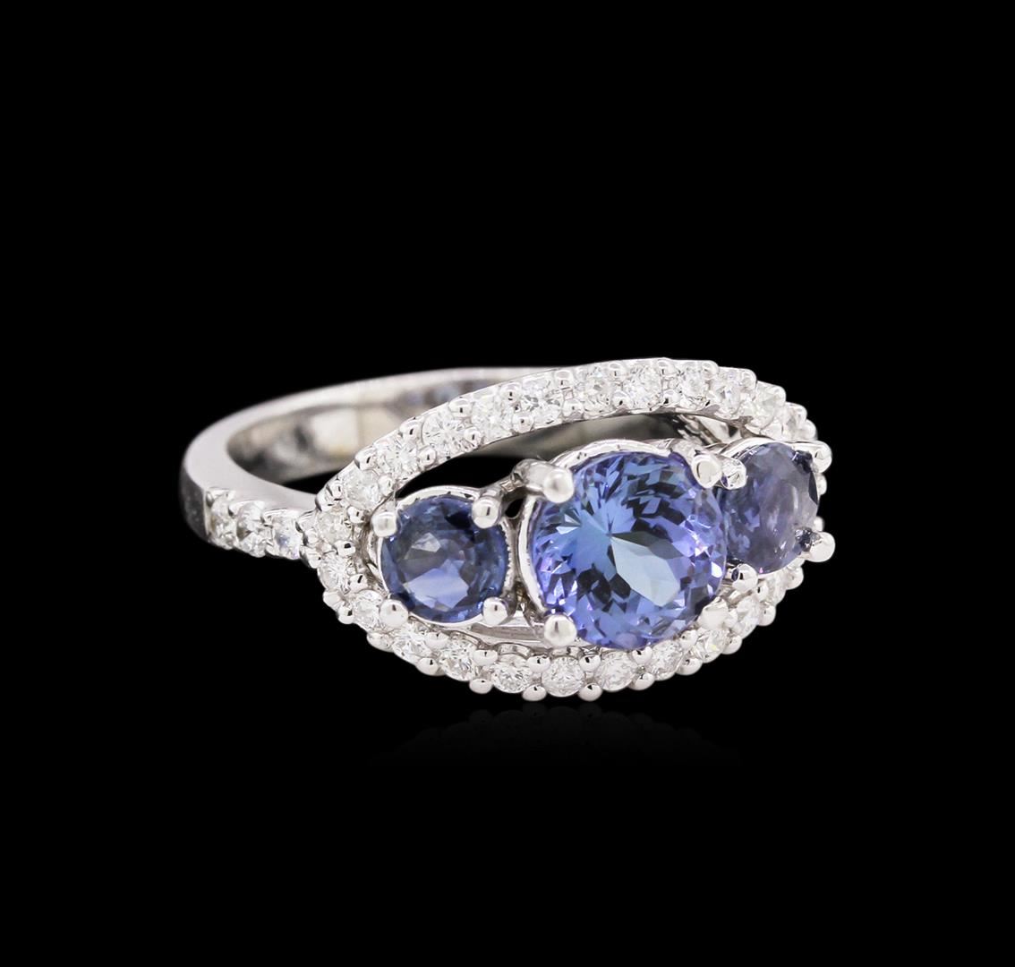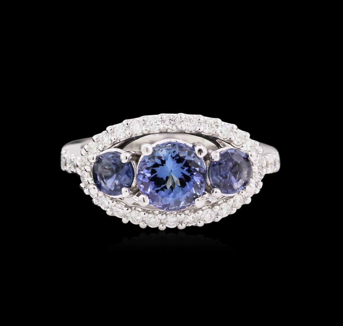 One ring featuring: 14KT white gold weighing 4.58 grams containing one tanzanite with a total weight of 1.27ct and 2 blue sapphires with a total weight of 0.61ct and side diamonds with a total weight of 0.42ct.