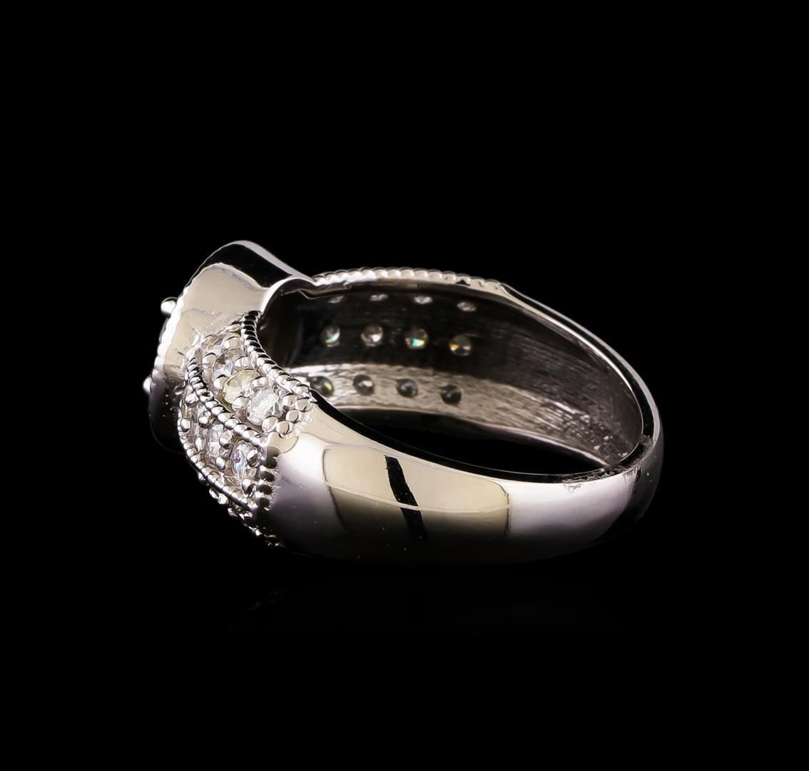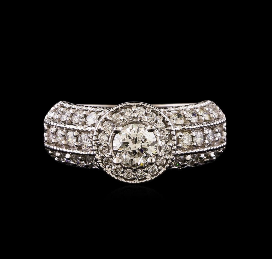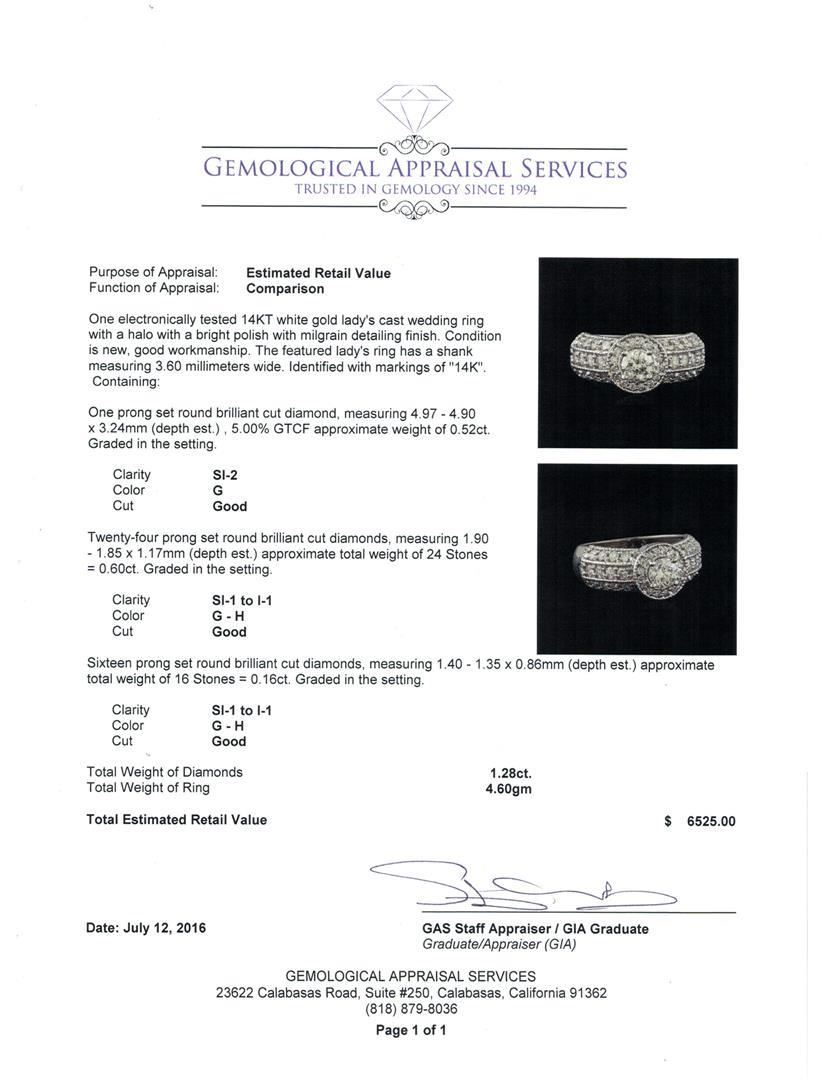 One electronically tested 14KT white gold lady's cast wedding ring with a halo with a bright polish with milgrain detailing finish. The featured lady's ring has a shank measuring 3.60 millimeters wide. Identified with markings of '14K'. Condition is new, good workmanship. Containing: One prong set round brilliant cut diamond, measuring 4.97 - 4.90 x 3.24mm (depth est.) , 5.00.%. GTCF approximate weight of 0.52ct. Graded in the setting. Clarity SI-2. Color: G Cut Good Twenty-Four prong set round brilliant cut diamonds, measuring 1.90 - 1.85 x 1.17mm (depth est.) approximate total weight of 24 Stones = 0.60 ct. Graded in the setting. Clarity SI-1 to I-1. Color: G - H Cut Good Sixteen prong set round brilliant cut diamonds, measuring 1.40 - 1.35 x 0.86mm (depth est.) approximate total weight of 16 Stones = 0.16ct. Graded in the setting. Clarity SI-1 to I-1. Color: G - H Cut Good. Total Weight of Diamonds 1.28ct.. Total Weight of Ring 4.60gm. GAS Appraised.
