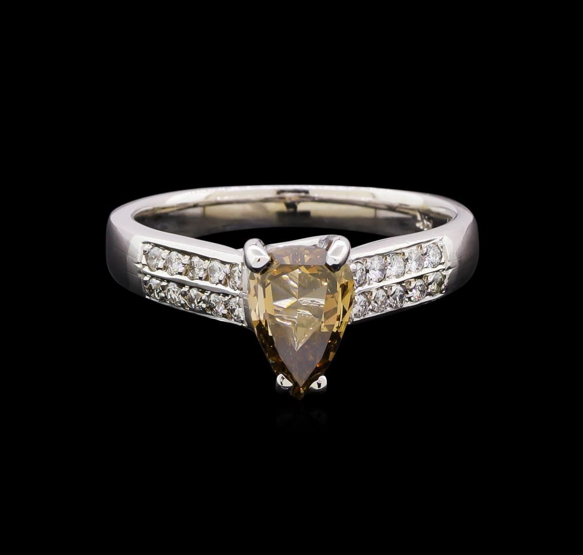One electronically tested 14KT white gold lady's cast fashion ring with a cathedral shank with a bright polish finish. Featured lady's ring has a shank measuring 4.60 millimeters in width. Identified with markings of "14K". Condition is new, good workmanship. Containing: One prong set pear shaped cut diamond, measuring 8.32 x 5.68 x 3.75mm (depth est.) approximate weight of 1.08ct. Colored gemstones are presumed to have been subjected to commonly used enhancement processes. Graded in the setting. Clarity: VS-2 Cut Good Twenty bead set round brilliant cut diamonds, measuring 1.40 - 1.30 x 0.81mm (depth est.) approximate total weight of 20 Stones = 0.20 ct. Graded in the setting. Clarity: SI-1 to SI-2. Color: G - Good. Total Weight of Diamonds 1.28ct. Total Weight of Ring 4.50gm. GAS Appraised.