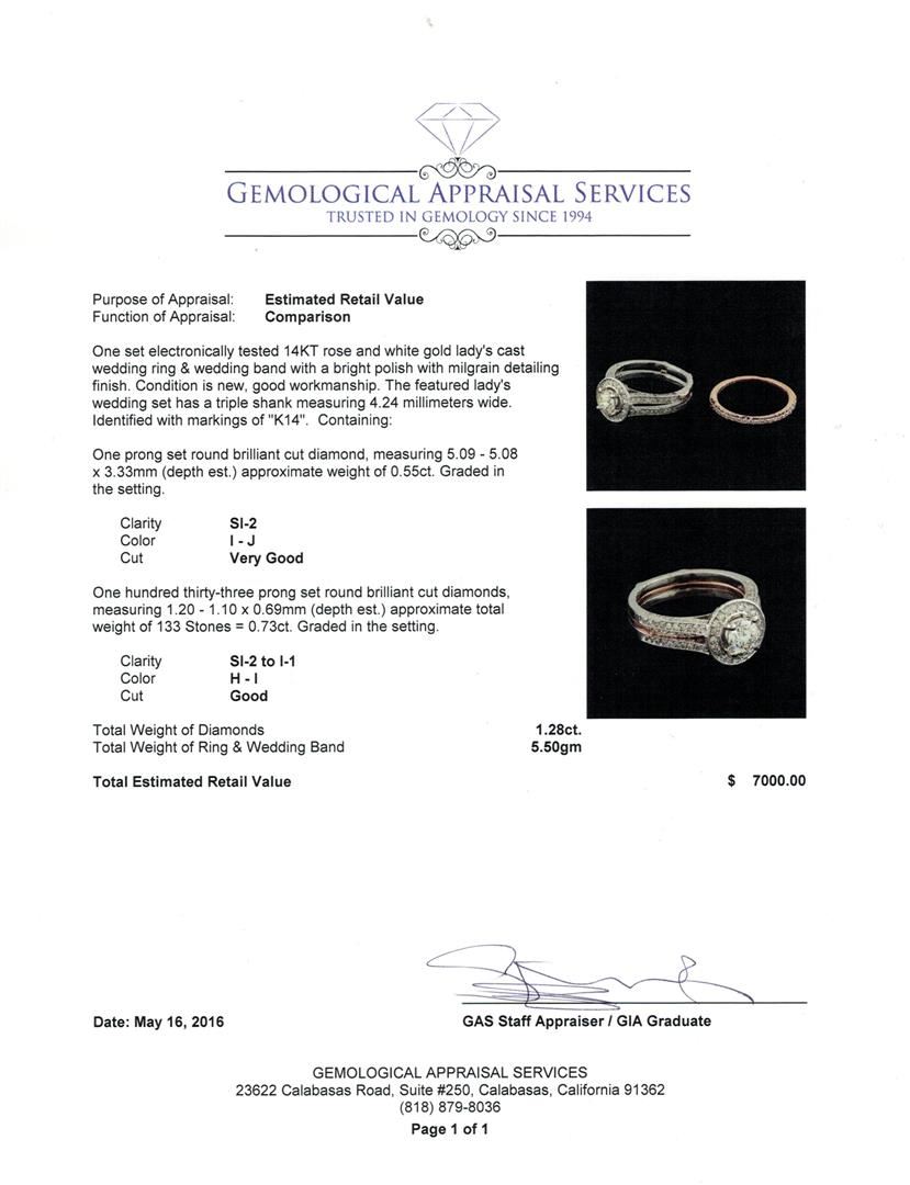 One set electronically tested 14KT rose and white gold lady's cast wedding ring & wedding band with a bright polish with milgrain detailing finish. The featured lady's wedding set has a triple shank measuring 4.24 millimeters wide. Identified with markings of "K14". Condition is new, good workmanship. Containing: One prong set round brilliant cut diamond, measuring 5.09 - 5.08 x 3.33mm (depth est.) approximate weight of 0.55ct. Graded in the setting. Clarity: SI-2. Color: I - Very Good One Hundred Thirty-Three prong set round brilliant cut diamonds, measuring 1.20 - 1.10 x 0.69mm (depth est.) approximate total weight of 133 Stones = 0.73ct. Graded in the setting. Clarity: SI-2 to I-1. Color: H - I. Cut Good. Total Weight of Diamonds 1.28ct. Total Weight of Ring & Wedding Band 5.50gm. GAS Appraised.