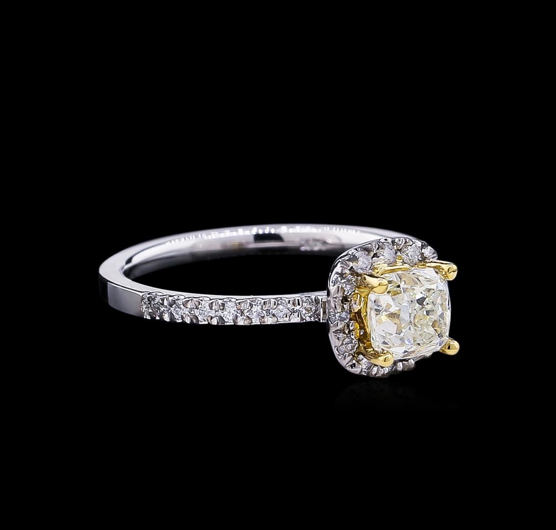 One electronically tested 14KT white and yellow gold lady's combination cast & assembled wedding ring with a halo with a bright polish finish. The featured lady's ring has a shank measuring 1.69 millimeters wide. Identified with markings of "14K". Condition is new, good workmanship. Containing: One prong set cushion cut diamond, measuring 5.24 x 5.00 x 4.00mm (depth est.) , 10.00.%. GTCF approximate weight of 1.00ct. Graded in the setting. Clarity: SI-1 Cut Good Twenty-Six prong set round brilliant cut diamonds, measuring 1.40 - 1.25 x 0.82mm (depth est.) approximate total weight of 26 Stones = 0.23ct. Graded in the setting. Clarity: SI-1 to I-1. Color: H - I. Cut Good Eight prong set round brilliant cut diamonds, measuring 1.20 - 1.15 x 0.73mm (depth est.) approximate total weight of 8 Stones = 0.05ct. Graded in the setting. Clarity: SI-1 to I-1. Color: H - I. Cut Good. Total Weight of Diamonds 1.28ct. Total Weight of Ring 2.70gm. GAS Appraised at $9,005.00.