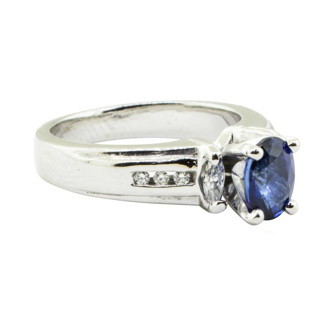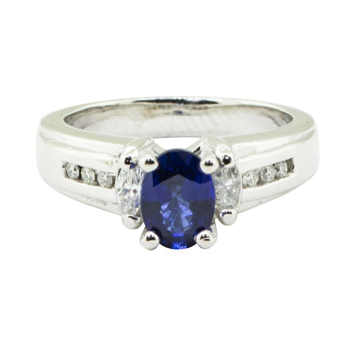 One electronically tested platinum lady's combination cast & assembled fashion straight line ring with a cathedral shank with a bright polish finish. The featured lady's ring has a shank measuring 3.00 millimeters in width. Identified with markings of 'PT 950'. Condition is like new, good workmanship. Containing: One prong set oval modified brilliant cut natural blue sapphire, measuring 7.08 x 5.10 x 3.20mm, (depth est.) 3%. bulge factor, approximate weight of 1.03ct., clarity is eye clean, medium dark, moderately strong, blue color, (GIA B 6/4), cut is very good. Transmitting light with no distortion, transparent. Colored gemstones are presumed to have been subjected to commonly used enhancement processes. Graded in the setting. Two prong set marquise shaped cut diamonds, measuring 4.15 x 2.10 x 1.32mm (depth est.) approximate total weight of 2 Stones = 0.15ct. Graded in the setting. Color H - I Clarity VS-2 to SI-1 Cut Very Good Six channel set round brilliant cut diamonds, measuring 1.60 - 1.55 x 0.95mm (depth est.) approximate total weight of 6 Stones = 0.10ct. Graded in the setting. Color H - I Clarity VS-2 to SI-1 Cut Very Good. Total Weight of Colored Stones 1.03ct.. Total Weight of Diamonds 0.25ct.. Total Weight of Ring 10.30gm GAS Appraised at $4050.00. GAS Appraised.