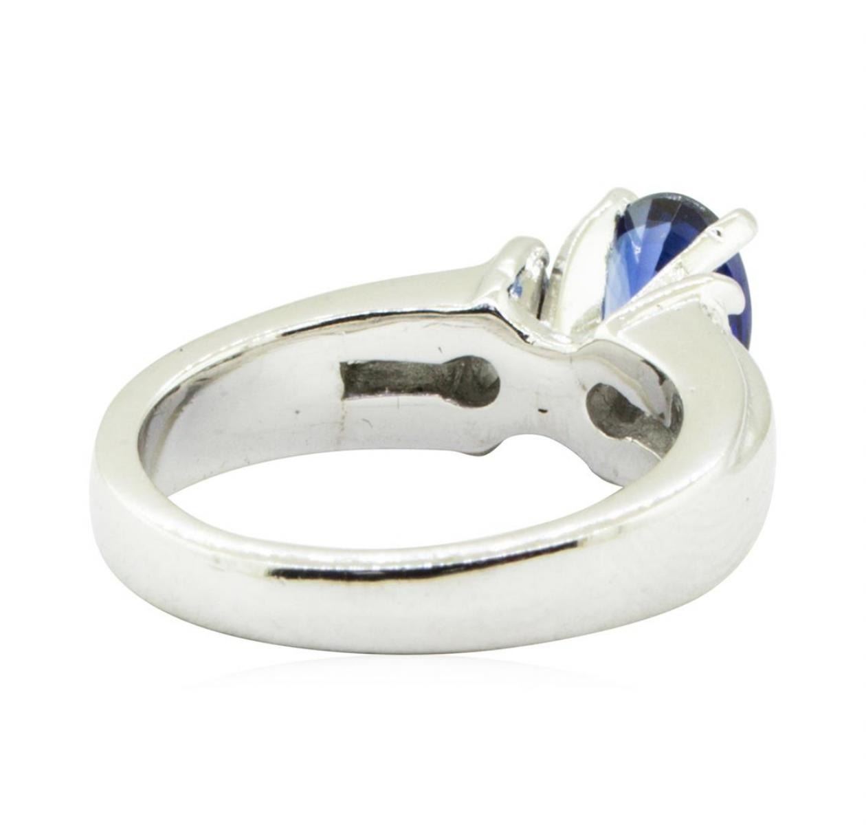One electronically tested platinum lady's combination cast & assembled fashion straight line ring with a cathedral shank with a bright polish finish. The featured lady's ring has a shank measuring 3.00 millimeters in width. Identified with markings of 'PT 950'. Condition is like new, good workmanship. Containing: One prong set oval modified brilliant cut natural blue sapphire, measuring 7.08 x 5.10 x 3.20mm, (depth est.) 3%. bulge factor, approximate weight of 1.03ct., clarity is eye clean, medium dark, moderately strong, blue color, (GIA B 6/4), cut is very good. Transmitting light with no distortion, transparent. Colored gemstones are presumed to have been subjected to commonly used enhancement processes. Graded in the setting. Two prong set marquise shaped cut diamonds, measuring 4.15 x 2.10 x 1.32mm (depth est.) approximate total weight of 2 Stones = 0.15ct. Graded in the setting. Color H - I Clarity VS-2 to SI-1 Cut Very Good Six channel set round brilliant cut diamonds, measuring 1.60 - 1.55 x 0.95mm (depth est.) approximate total weight of 6 Stones = 0.10 ct. Graded in the setting. Color H - I Clarity VS-2 to SI-1 Cut Very Good. Total Weight of Colored Stones 1.03ct.. Total Weight of Diamonds 0.25ct.. Total Weight of Ring 10.30gm GAS Appraised at $4050.00. GAS Appraised.